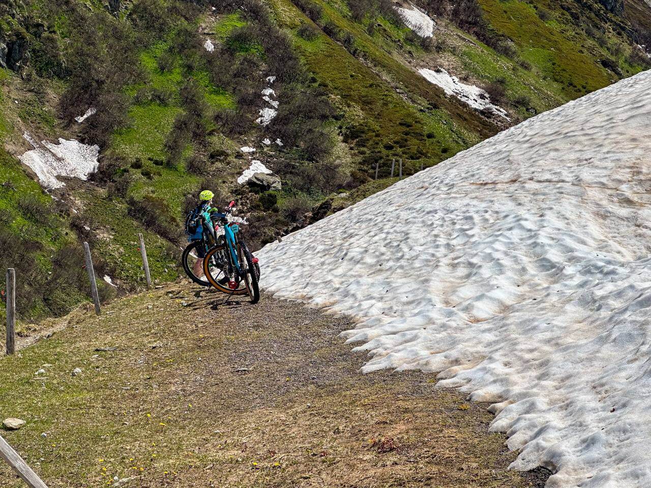 Das Wetter ist wieder perfekt. Nach dem Frühstück fahren wir mit den Rädern ins Unteralbtal hinauf. Ich bin schon mehrfach in das Tal hineingewandert und heute wollen wir sehen wie weit wir mit den Rädern kommen. Der Weg zieht sich immer ins Tal hinauf und nachdem wir, mehr oder weniger trocken, einen Bachlauf durchquert und ein Schneefeld überquert haben ist auf knapp 2000m Höhe der Weg zu ende, Schnee! Ab hier ist alles zu, weiterkommen unmöglich. Wir schauen noch ein wenig und fahren dann ca. 100m zurück zu einer Hütte mit schöner Sitzgelegenheit davor. Hier rasten wir erst mal und genießen die Landschaft. Es ist wunderschön hier oben.