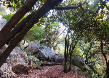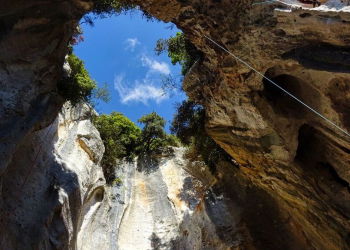 Schön, aber was jetzt und wie weiter. Als drei Italienische MTB Cracks anhalten und mich fragen wo ich hinwill, erklären sie mir das ich besser zurück fahren soll. In diese Richtung unfahrbar. Also umdrehen. Über Finale drehe ich dann in Richtung Grotte. Als ich oben ankomme, wieder unfahrbar abwärts. Ich fahre dieselbe Strecke ein Stück zurück, schließe dann das Fahrrad an und wandere/klettere das letzte Stück zum Ziel. Nach ca. 45min sehr anstrengendem Aufstieg stehe ich in der Grotte. Naja ne Grotte halt….Als dann 2 Schweizer von oben heruntergeklettert kommen und mir erklären daß der eigentliche Teil erst weiter oben beginnt, klettere ich auch in der Grotte nach oben. An Seilen…! Die Hüfte freut sich ….Hurra!