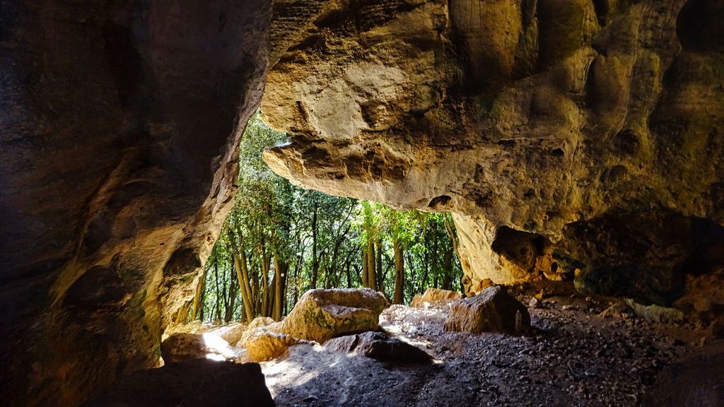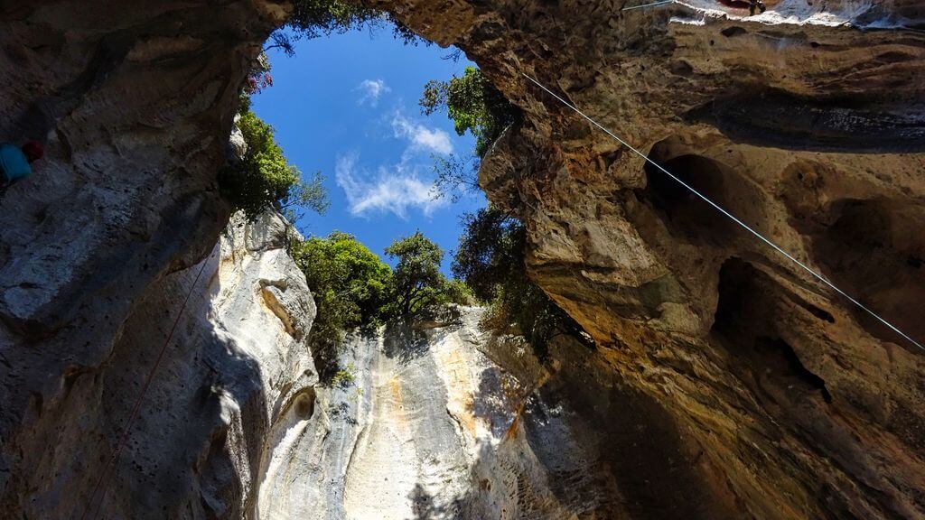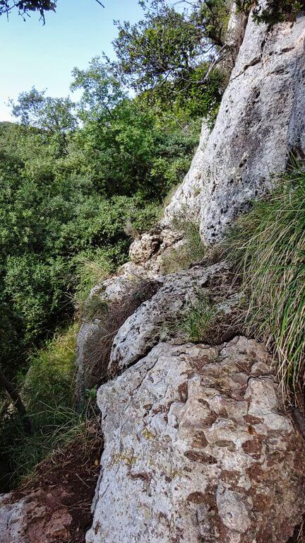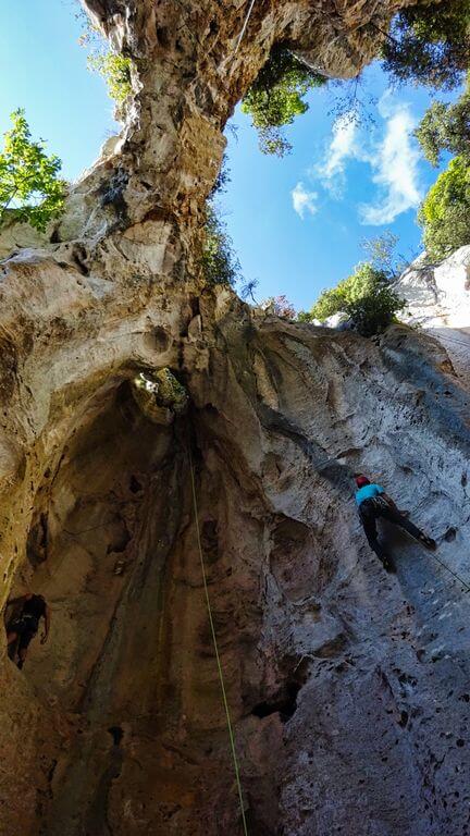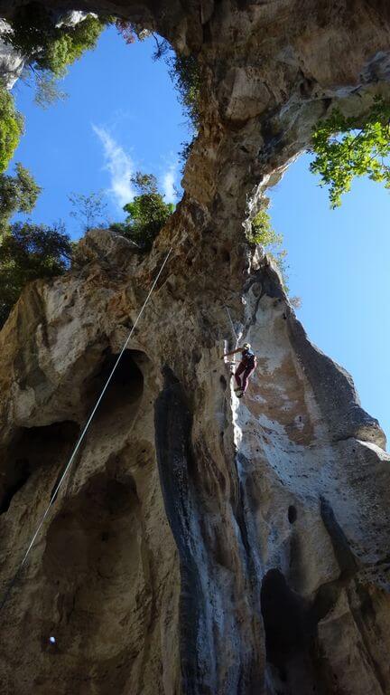 Schön, aber was jetzt und wie weiter. Als drei Italienische MTB Cracks anhalten und mich fragen wo ich hinwill, erklären sie mir das ich besser zurück fahren soll. In diese Richtung unfahrbar. Also umdrehen. Über Finale drehe ich dann in Richtung Grotte. Als ich oben ankomme, wieder unfahrbar abwärts. Ich fahre dieselbe Strecke ein Stück zurück, schließe dann das Fahrrad an und wandere/klettere das letzte Stück zum Ziel. Nach ca. 45min sehr anstrengendem Aufstieg stehe ich in der Grotte. Naja ne Grotte halt….Als dann 2 Schweizer von oben heruntergeklettert kommen und mir erklären daß der eigentliche Teil erst weiter oben beginnt, klettere ich auch in der Grotte nach oben. An Seilen…! Die Hüfte freut sich ….Hurra!