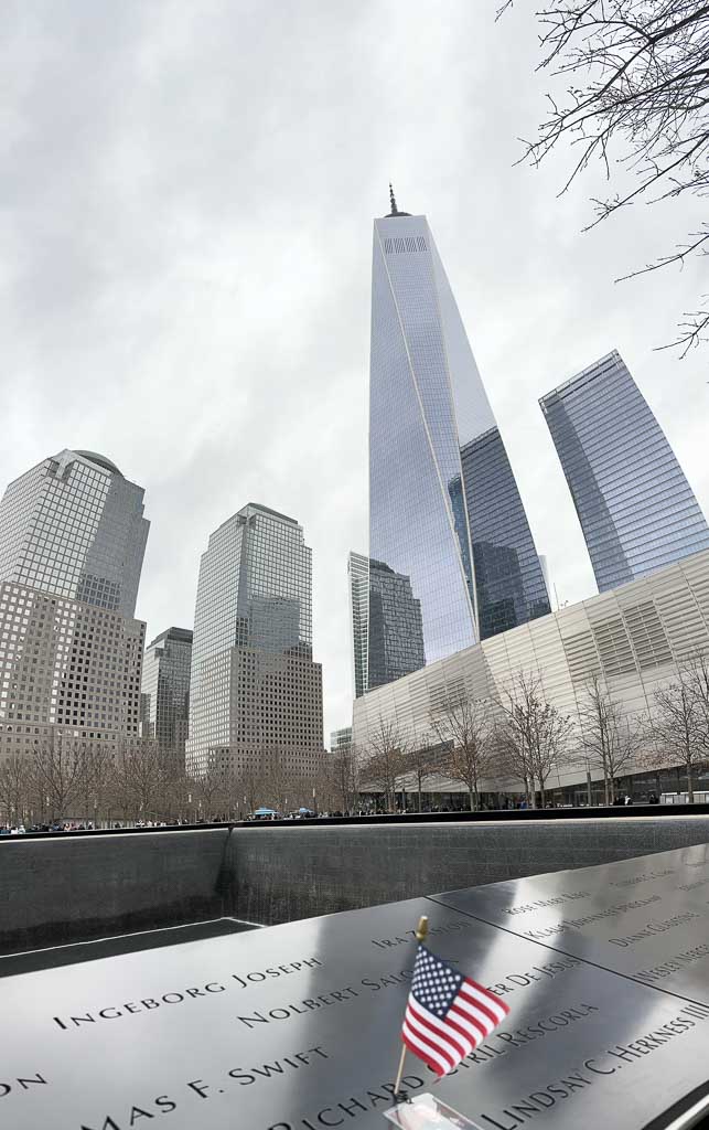 Einfach Wow, die Brücke, die Konstruktion, die Größe und das Panorama auf Manhattan. Haben die doch schon vor vielen Jahren hier echte Wunderwerke gebaut. In Manhattan angekommen fahren wir mit der Subway weiter bis zur Wall Street. Hier ist das Zentrum der Finanzwelt. Es ist inzwischen schon nach 12.00 Uhr und ein leichter Hunger macht sich bemerkbar. An einem der vielen Imbissbuden esse ich ein Steak Sandwich. Sehr lecker aber beim Essen werden wir Ziel der regionalen Taubenwelt und flüchten. Wir laufen die Strasse weiter und kommen am 9/11 Monument an.