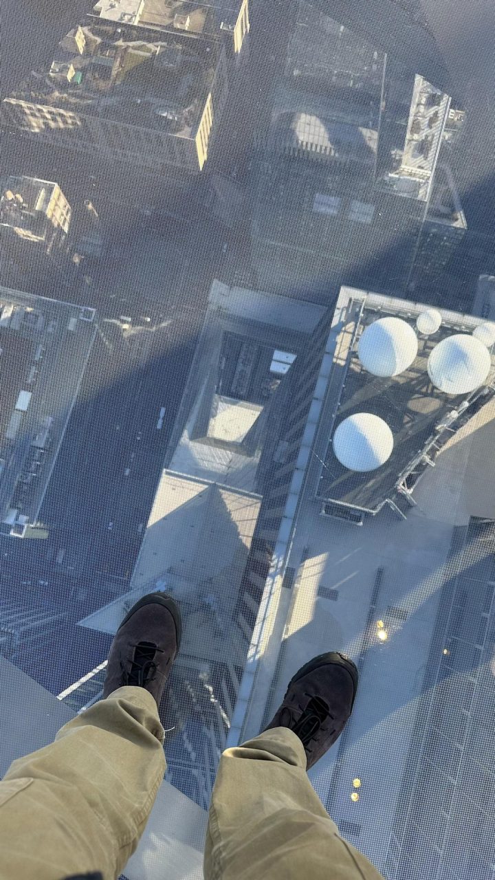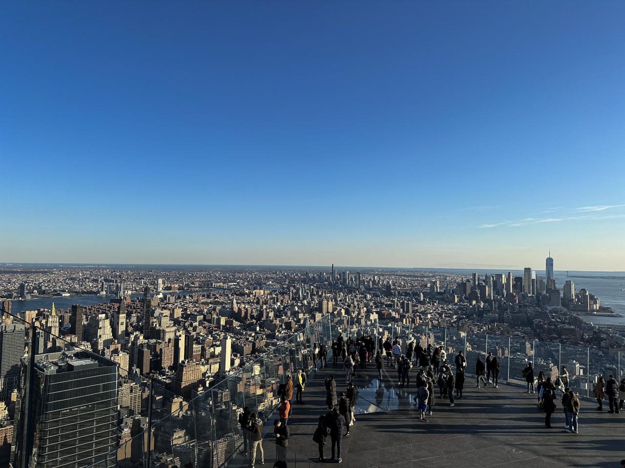 Nach gut 1,5h bin ich am südlichen Ende/Anfang des Parks angelangt und gehe erst mal einen Kaffee trinken. Sitzen ist gar keine schlechte Idee, man merkt schon die Beine. Ich miete mir ein Fahrrad und radele einmal rund um den Central Park. Nach einer ¾ Stunde bin ich rum. War tatsächlich anstrengend geht es doch hoch und runter. Nachdem ich das Bike wieder abgegeben habe geht es mit der U-Bahn zum Empire State Building. Zurück an der Oberfläche sehe ich das Peloton ganz in der Nähe ist und mir fallen die Einkaufsaufträge wieder ein, ab in den Store….Fehlanzeige. Als ich aus dem Store komme bin ich unmittelbar unter „The Edge“, einer weiteren Aussichtsplattform.Ich fahre mit dem Aufzug ins 100. Stockwerk…..in 47s !! Allein das Aufzugfahren in den Wolkenkratzern ist schon der Hit. Oben angekommen ist es sensationell. Eine Plattform, wie ein Balkon ans Gebäude angehängt in ca. 300m Höhe. Mit Glasboden