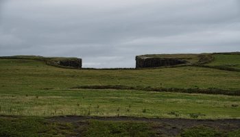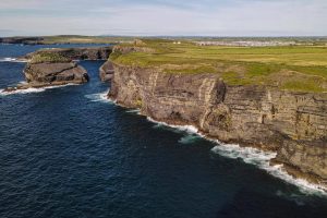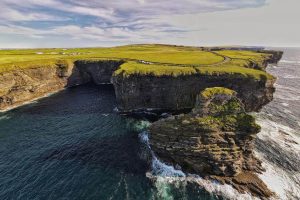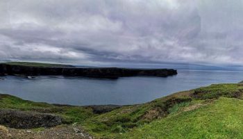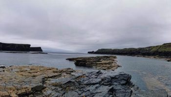 Es ist sehr trüb heute morgen. Nach dem Frühstück fahren wir weiter den Wild Atlantic Way. Inzwischen regnet es . Wir fahren zum Donegal Point. Eigentlich wissen wir nicht was uns da erwartet, wir haben den Punkt nur auf der Karte gesehen. Es ist eigentlich völlig unwirklich. Über kleinste einspurige „Strassen“ fahren wir durch die irischen Felder und plötzlich stehen wir am Rand der Steilklippen. Ein kleiner Pfad führt bis ans Meer runter. Absolut schön hier. Das es regnet tut der Sache keinen Abbruch. Als wir wieder nach oben klettern und etwas am Rand der Klippen entlang wandern stehen wir mitten auf einer Pferdeweide. Grüne Weide, soweit das Auge sehen kann und ein Stück weiter ein Riesen Krater wo die Küste abgebrochen ist.