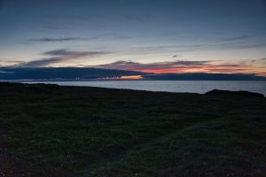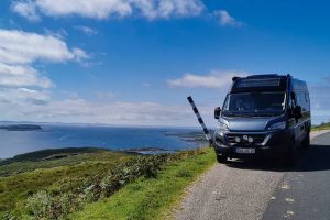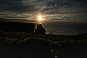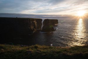 Leichter Nieselregen am Morgen, aber schon besser als gestern. Heute fahren wir den „Ring of Kerry“ eine 179,0 km lange Panoramaküstenstraße im Südwesten Irlands. Als wir losfahren hört der Nieselregen auf. und es beginnt aufzuklaren. Eine phantastische Landschaft bietet sich uns . Erst zieht sich die Strasse durch das Land die Berge hinauf. Nach jeder Kurve ergeben sich neue Blicke auf die großartige Landschaft. Und Kurven hat die Strasse genug. Ich bin froh das Karsten nicht breiter ist. Es ist überall eng und die Seiten hoch zugewachsen. Auch über die Luftfederung und höheren Federn an der Front bin ich sehr glücklich. War eine gute Investition! Der Ring of Kerry mündet dann in den Wild Atlantic Way. Inzwischen ist das Wetter super und die Sonne scheint satt. Nach kurzer Zeit sind wir am Atlantik und ….. was soll ich sagen …. Boah. Wir parken an einem Spot und laufen an den Ozean runter. Es ist gerade Ebbe und das Meer ist kalt. Aha…..deswegen haben auch alle Schwimmer Neopren an. Wir fahren weiter. Am Nachmittag überqueren wir den Shannon mit der Fähre und fahren bis Kilkee. Die dort ausgewiesenen Parkplätze haben alle eine Höhenbeschränkung und sind somit nicht für uns geeignet. Park4Night zeigt uns etwas außerhalb noch einen Übernachtungsplatz an den wir auch anfahren…….. Hammerplatz…… direkt oberhalb der Steilküste. Spektakulär. Die Steaks die wir gestern beim Metzger gekauft haben wandern auf den Grill und die Kartoffeln in die Pfanne. Irgendwie war das mit den Kartoffeln nix. Haben sie nicht weichbekommen aber die Steaks waren dafür fantastisch. Der Abend endet mit einem sehenswerten Sonnenuntergang. Alles Top heute.