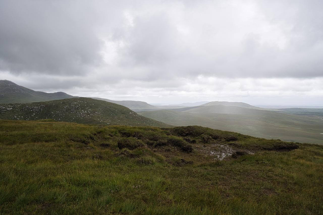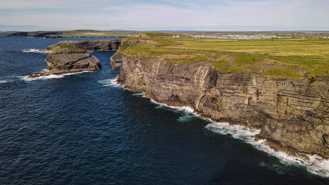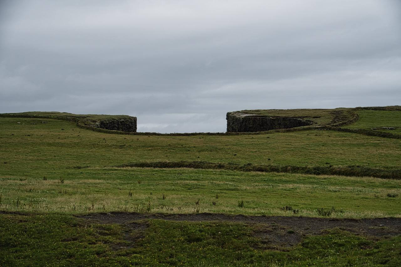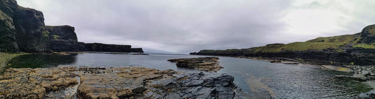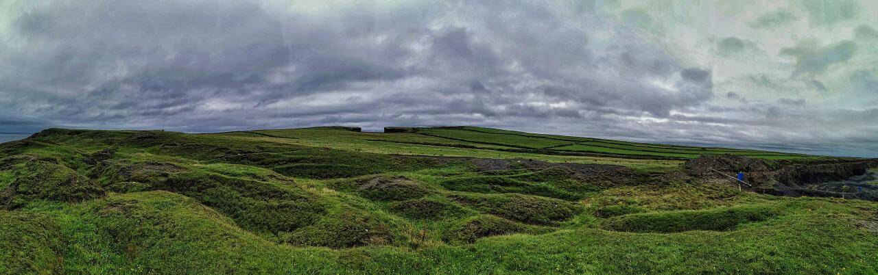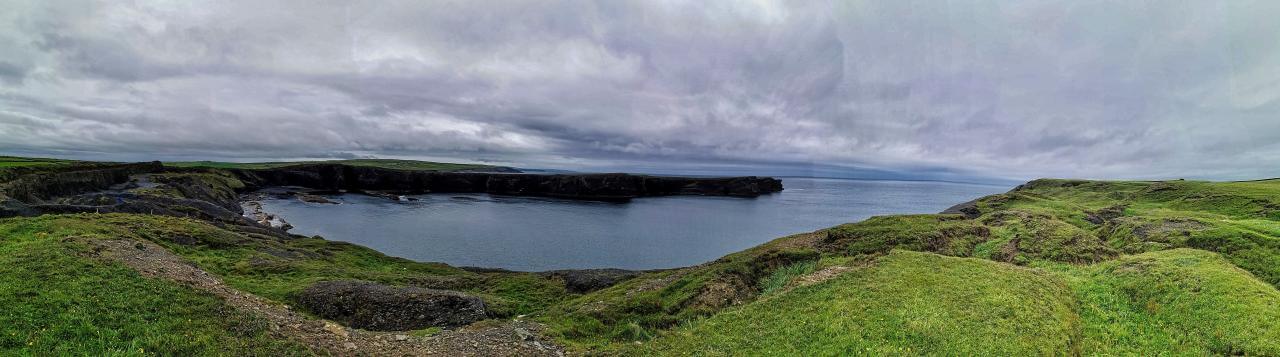 Es ist sehr trüb heute morgen. Nach dem Frühstück fahren wir weiter den Wild Atlantic Way. Inzwischen regnet es . Wir fahren zum Donegal Point. Eigentlich wissen wir nicht was uns da erwartet, wir haben den Punkt nur auf der Karte gesehen. Es ist eigentlich völlig unwirklich. Über kleinste einspurige „Strassen“ fahren wir durch die irischen Felder und plötzlich stehen wir am Rand der Steilklippen. Ein kleiner Pfad führt bis ans Meer runter. Absolut schön hier. Das es regnet tut der Sache keinen Abbruch. Als wir wieder nach oben klettern und etwas am Rand der Klippen entlang wandern stehen wir mitten auf einer Pferdeweide. Grüne Weide, soweit das Auge sehen kann und ein Stück weiter ein Riesen Krater wo die Küste abgebrochen ist.