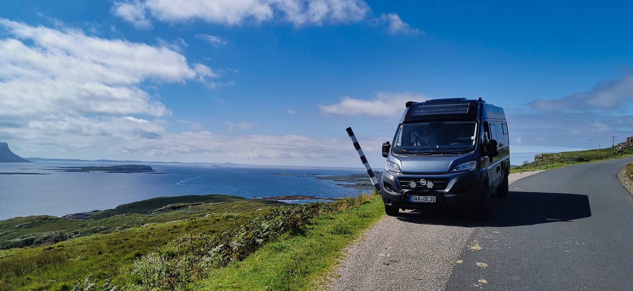 Morgens um kurz nach 6 ist hier schon was los. Etliche Jogger und eine Crossfitgruppe trainieren neben Karsten. Ich will Brötchen holen, aber als ich, nachdem ich losgelaufen bin, nochmal Maps konsultiere lass ich es. Knappe Stunde zu Fuß zum Bäcker…eher nicht. Dann gibt´s halt Toast, ist ja alles noch da. Nach dem Frühstück fahren wir los zum Loch Lomont Nationalpark. Unterwegs tanken und Wasser auffüllen und nach einer Stunde sind wir da. Wir parken direkt am See. Steffen baut die zwei SUP´s auf und los geht es. Wir paddeln ca. 2h um die eine Seespitze und queren dann zurück zu Karsten. Umgekehrt wäre es wohl einfacher gewesen, das queren gegen den Wind und die resultierenden Wellen ist nicht ohne. Ganz schön anstrengend so eine SUP Tour 😅. In der Badebucht vor Karsten machen wir an eine Boje fest und ruhen dann erst mal eine Weile aus. Nachdem wir geduscht und sie Boards verpackt haben fahren wir weiter nach Norden. Die Highlands beginnen. Eine tolle Landschaft wie man es sich vorstellt. Es ist hier mehr los als bis jetzt. Mitten in den Highlands, bleiben wir auf dem Parkplatz eines Skilift´s über Nacht. Hier gibt es tatsächlich ein Skigebiet. Was es hier auch gibt sind Kribbelmücken, etwa wie Obstfliegen. Nervig aber der noch kurz vor Abfahrt angeschaffte Mückenstecker in Karsten funktioniert ganz gut. Wir überlegen noch die Tour zu ändern soll es auf Skye doch Donnerstag regnen. Die Alternative ist die Isle of Mull.