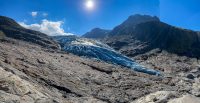 Die Wanderung zum Svartisen Gletscher steht heute auf dem Plan. Um 10:55 Uhr stehe ich am Pier wo das Boot zum Gletscher abfährt. Pünktlich läuft der Personenkutter ein, aber als ich einsteigen will winkt der Skipper ab und zeigt auf ein danebenliegendes RIB-Speedboot. Kurz noch Schwimmwesten anlegen dann geht es mit 10 andern Passagieren los. Ich hätte gerne ein Foto unterwegs gemacht war, war aber mit Festhalten beschäftigt. DAs Boot macht 50 Knoten, etwa 93km/h. Nach 3min Fahrzeit waren wir am anderen Ufer des Fjords. Für die Überfahrt braucht der Kutter 15min! Was ein Spass! Das war mal echt Glück🍀.
