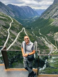 Anders der Trollstiegen. Schon auf der Anfahrt…gewaltige Berge und Ausblicke auf diesen Anstieg. Die Bergstrasse ist einspurig und zieht sich über elf Haarnadelkurven hoch zur Passhöhe. Links und rechts Wasserfälle. Genau das Richtige für mich. Hier und da Ausweichbuchten und als ein Reisebus entgegen kommt ist es auch schon „eng“. Die Aussichtsplattform bietet einen fantastischen Ausblick über das Romsdalen.