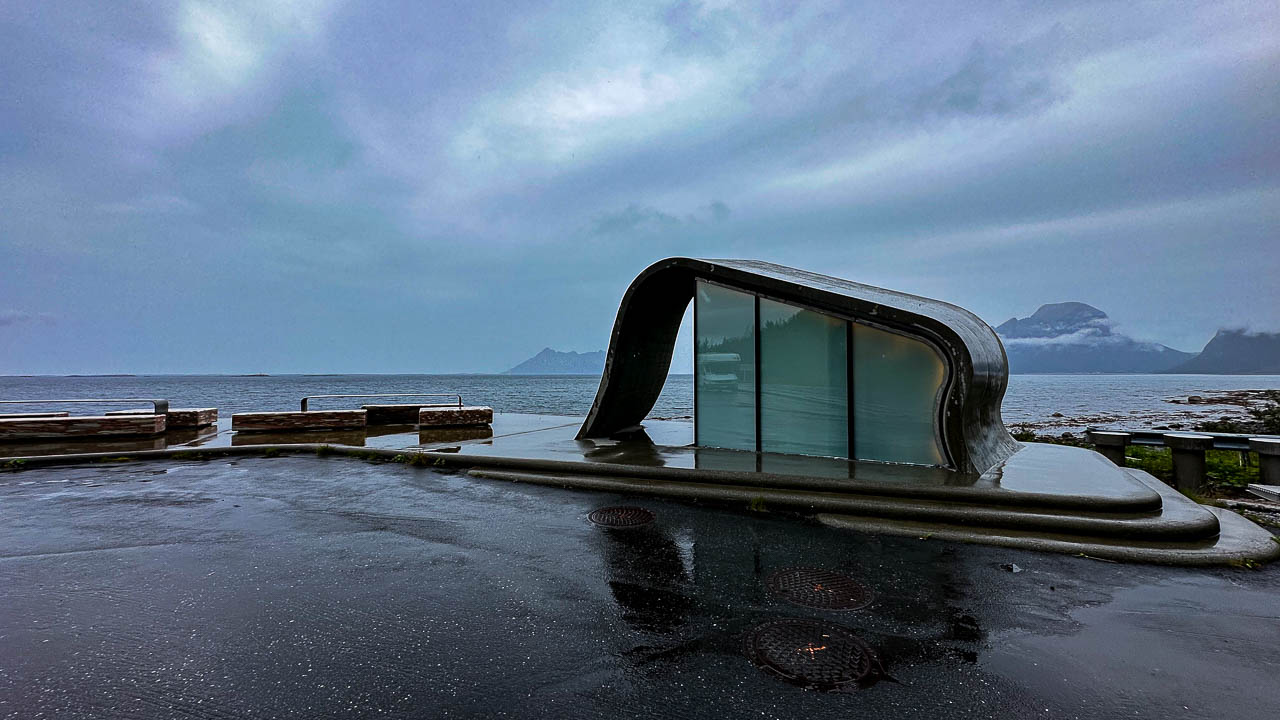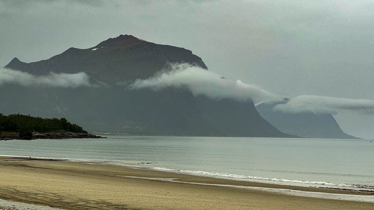 Es hat heute Nacht angefangen zu regnen. Ich bin von den ersten Tropfen auf dem Dach wachgeworden und hab die Wäsche, die ich gestern nach dem Baden aufgehängt habe, noch rechtzeitig ins Auto geholt. Glück gehabt! Als ich um 07:30 Uhr aufwache regnet es weiterhin. Nach dem Frühstück fahre ich weiter nach Süden die FV17 entlang. Obwohl es regnet ist die Landschaftsroute absolut faszinierend. Steile Berge, türkisfarbene Fjorde und Sandstände wechseln sich auf den nächsten 100km ab. Kurz nach dem 7,6km langen Svartisentunnel ist die Bootsanlegestelle um über den Holandsfjord zu fahren und zum Svartisen Gletscher zu wandern. Im Regen macht das aber heute keinen Sinn und so fahre ich, nachdem ich mich über den Fahrtzeiten informiert habe, 16km weiter zum Furøy Campingplatz in Halsa. Ich nutze den verregneten Tag und lege einen Waschtag ein. Morgen soll laut Wettervorhersage wieder bestes Wetter sein.