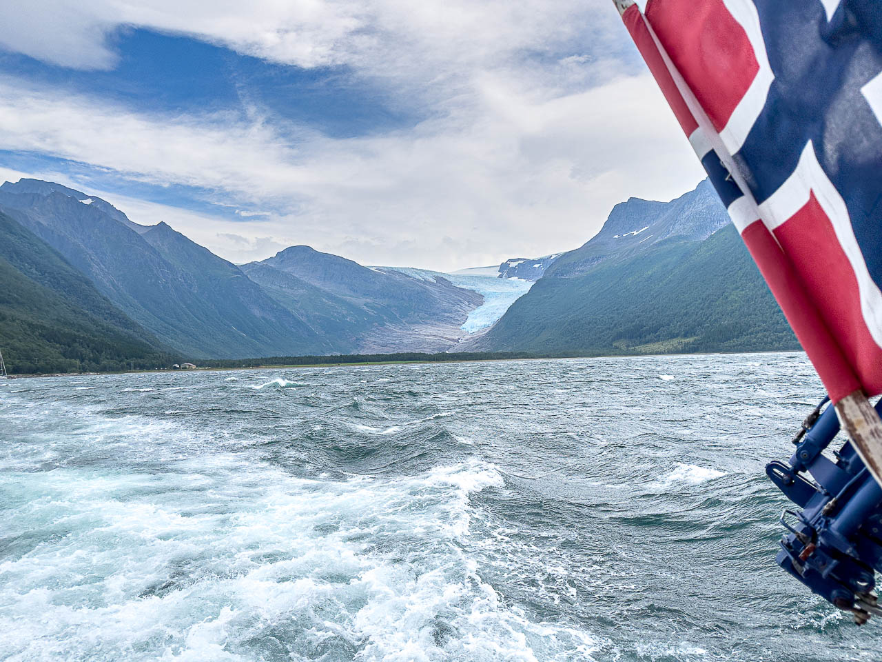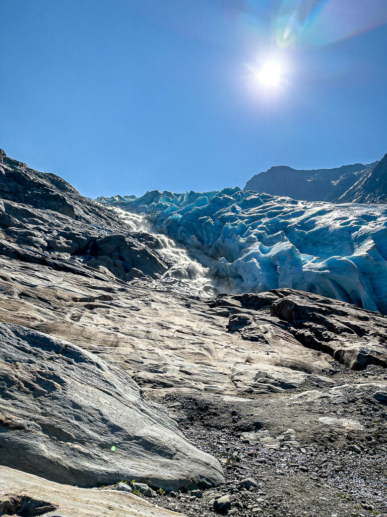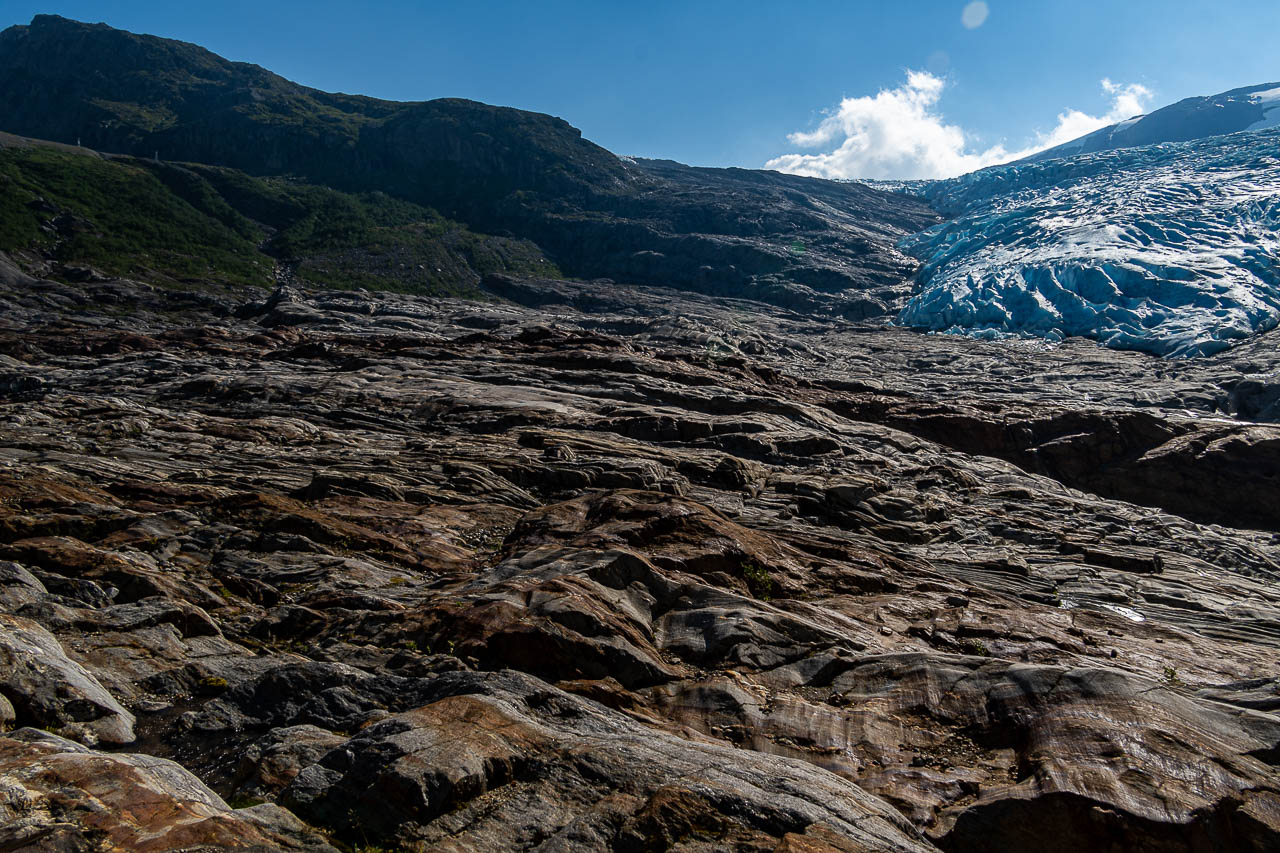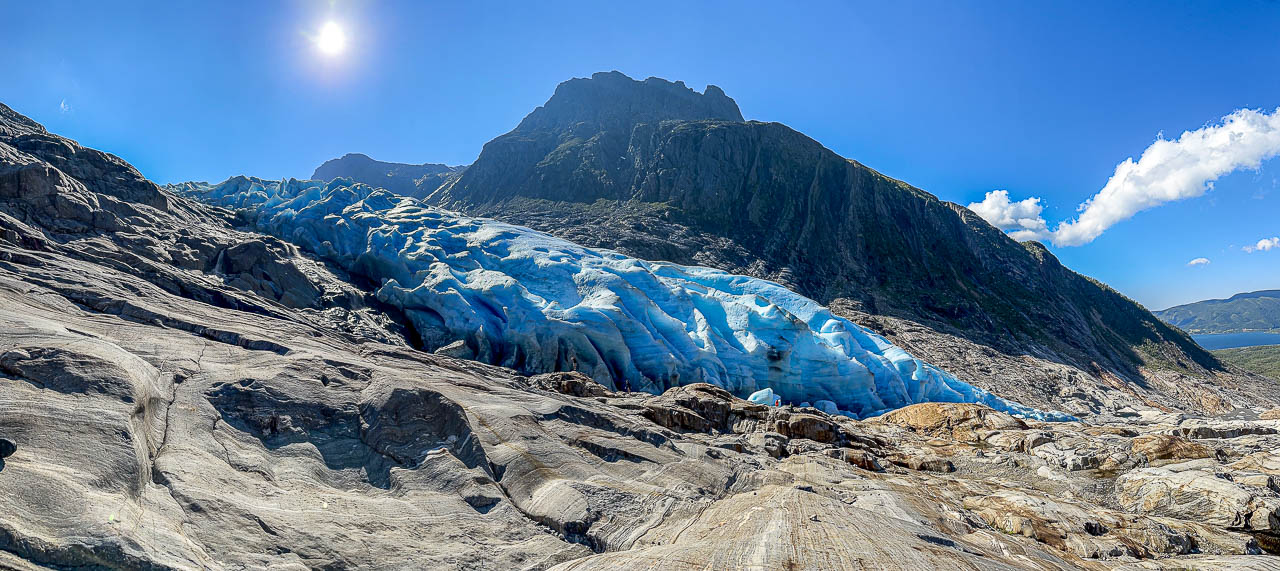 Die Wanderung zum Svartisen Gletscher steht heute auf dem Plan. Um 10:55 Uhr stehe ich am Pier wo das Boot zum Gletscher abfährt. Pünktlich läuft der Personenkutter ein, aber als ich einsteigen will winkt der Skipper ab und zeigt auf ein danebenliegendes RIB-Speedboot. Kurz noch Schwimmwesten anlegen dann geht es mit 10 andern Passagieren los. Ich hätte gerne ein Foto unterwegs gemacht war, war aber mit Festhalten beschäftigt. DAs Boot macht 50 Knoten, etwa 93km/h. Nach 3min Fahrzeit waren wir am anderen Ufer des Fjords. Für die Überfahrt braucht der Kutter 15min! Was ein Spass! Das war mal echt Glück🍀.