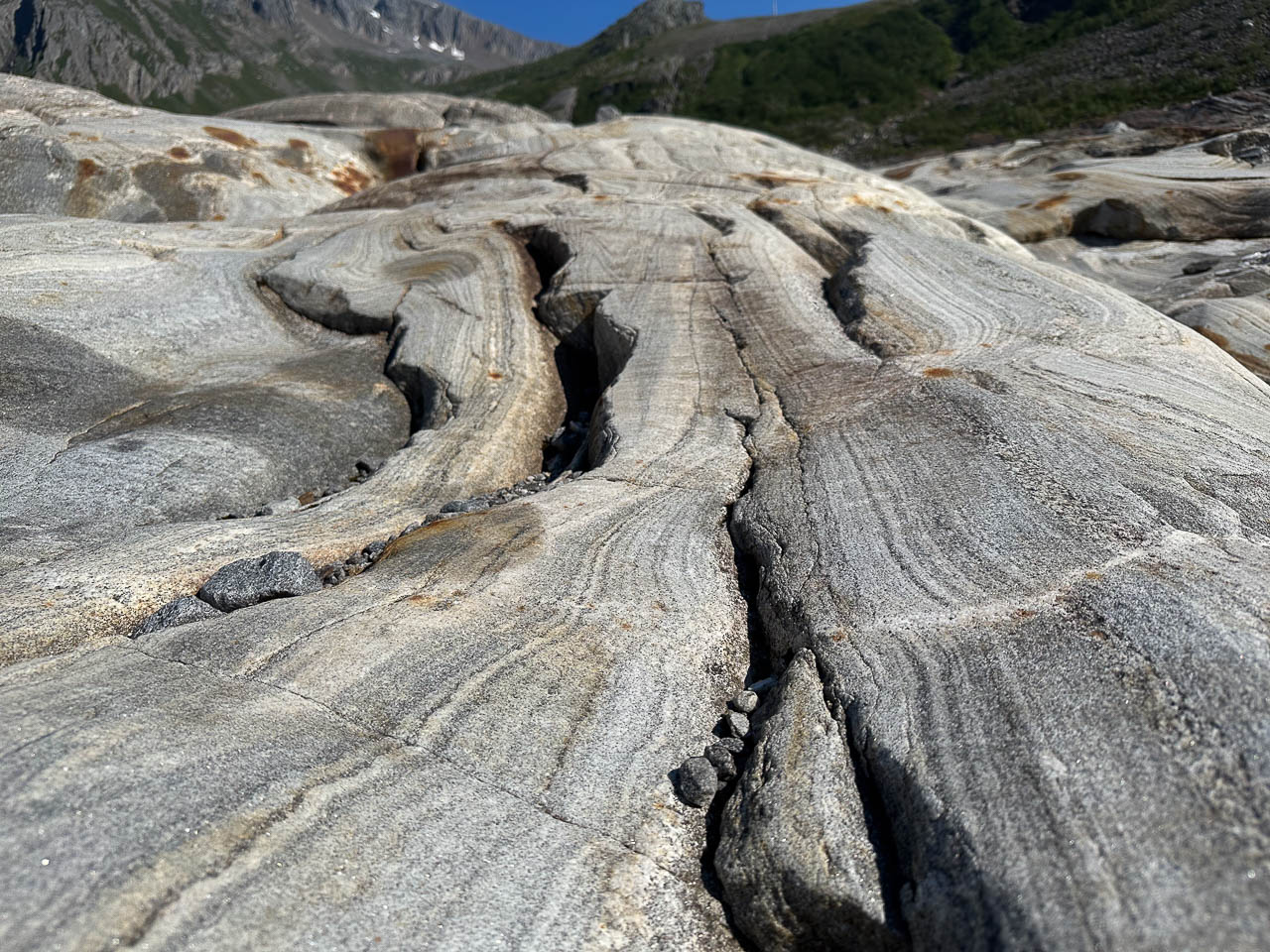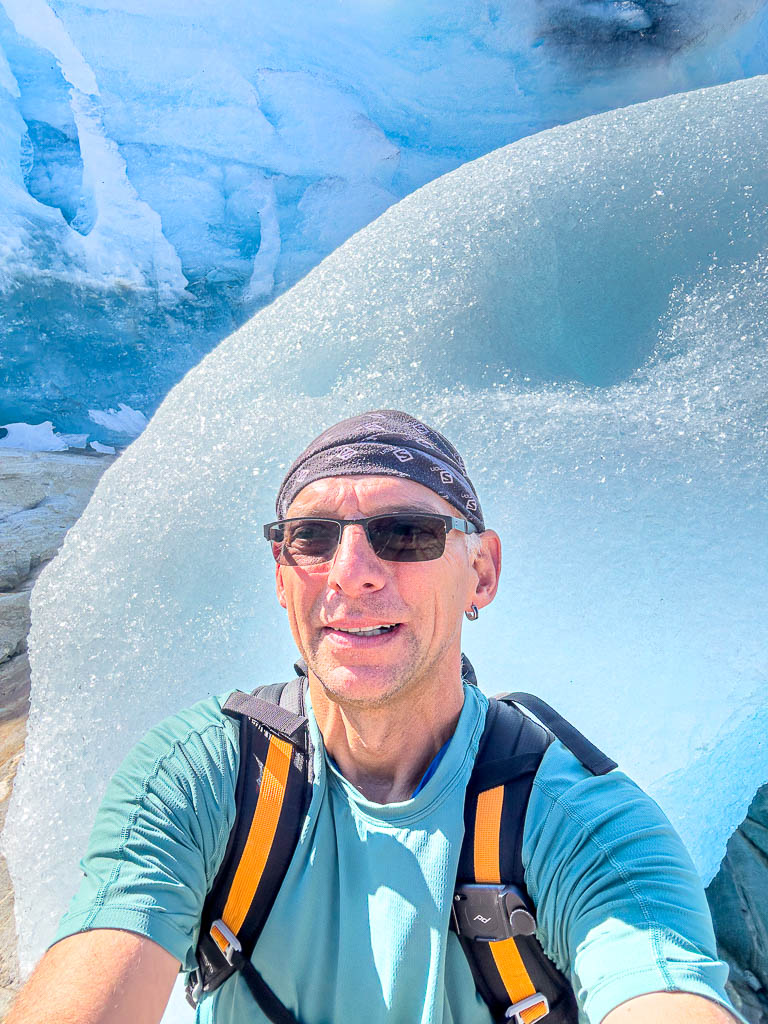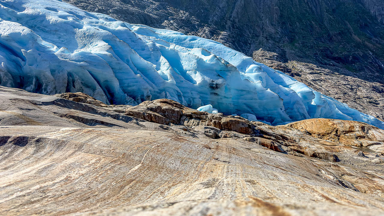 Die Wanderung zum Svartisen Gletscher steht heute auf dem Plan. Um 10:55 Uhr stehe ich am Pier wo das Boot zum Gletscher abfährt. Pünktlich läuft der Personenkutter ein, aber als ich einsteigen will winkt der Skipper ab und zeigt auf ein danebenliegendes RIB-Speedboot. Kurz noch Schwimmwesten anlegen dann geht es mit 10 andern Passagieren los. Ich hätte gerne ein Foto unterwegs gemacht war, war aber mit Festhalten beschäftigt. DAs Boot macht 50 Knoten, etwa 93km/h. Nach 3min Fahrzeit waren wir am anderen Ufer des Fjords. Für die Überfahrt braucht der Kutter 15min! Was ein Spass! Das war mal echt Glück🍀.