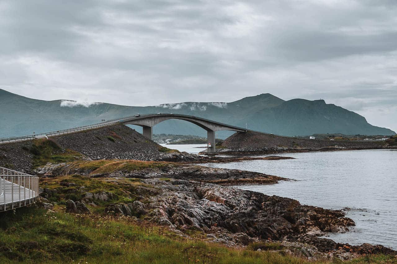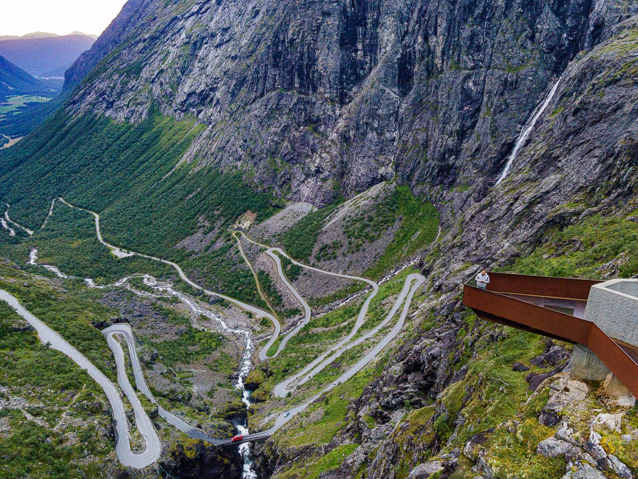 Anders der Trollstiegen. Schon auf der Anfahrt…gewaltige Berge und Ausblicke auf diesen Anstieg. Die Bergstrasse ist einspurig und zieht sich über elf Haarnadelkurven hoch zur Passhöhe. Links und rechts Wasserfälle. Genau das Richtige für mich. Hier und da Ausweichbuchten und als ein Reisebus entgegen kommt ist es auch schon „eng“. Die Aussichtsplattform bietet einen fantastischen Ausblick über das Romsdalen.