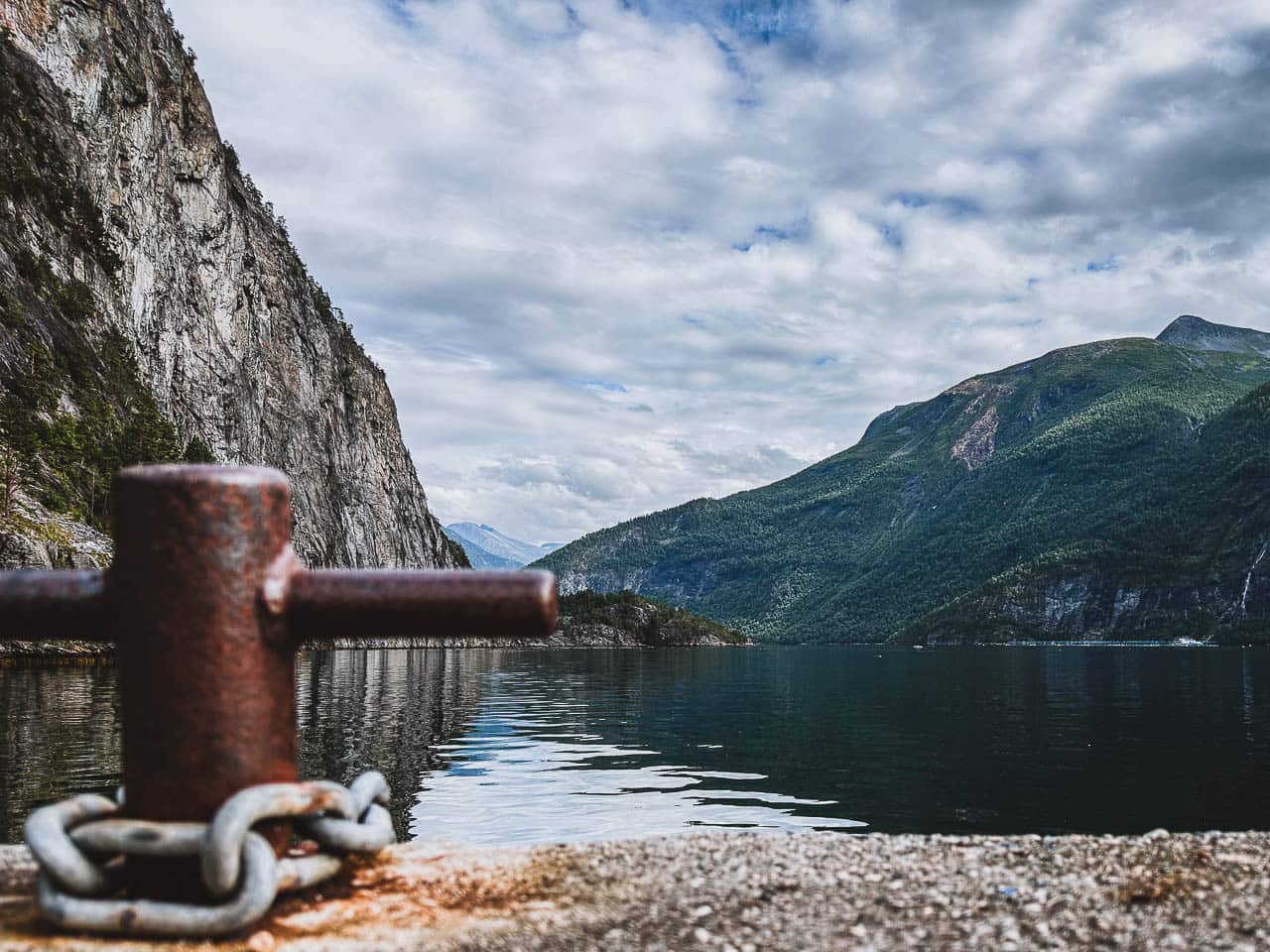 Das Wetter spielt mit! Es hat in der Nacht ein wenig geregnet aber jetzt scheint die Sonne. Gegen 10:00 Uhr starte ich die Wanderung zum Stabbeskaret. Kurz nachdem ich vom Hauptweg auf den Wanderpfad abgebogen bin geht der über Felstreppen steil hoch und dann über einen, mit Kette abgesicherten, schmalen Felsvorsprung. Fängt ja gut an! Im weiteren Verlauf führt die Strecke erst über einem Bergpfad, dann steil zu einem Plateau hinauf. Ab da geht der Weg, wenn man das so bezeichnen will, ausschließlich über Geröll und Felsbrocken. Nachdem ich das Plateau überquert habe geht es weiterhin steil über Geröll und Felsen hoch. Nach 2 Stunden entscheide ich mich umzukehren. Ich habe noch etwa 1,5km vor mir und laut Beschreibung entgegenkommender Wanderer wird nur noch über große Felsen und Vorsprünge bis zum Grat geklettert. Das Wetter ändert sich auch gerade und im Regen möchte ich diese Strecke nicht gehen müssen. Gegen 15 Uhr bin ich wieder an Karsten angekommen und als ich etwa eine halbe Stunde später losfahre in Richtung Geirangerfjord fängt es an zu Regnen. Alles richtig gemacht! Trotzdem ich nicht bis ganz nach oben gekommen bin war es eine super Tour für mich.