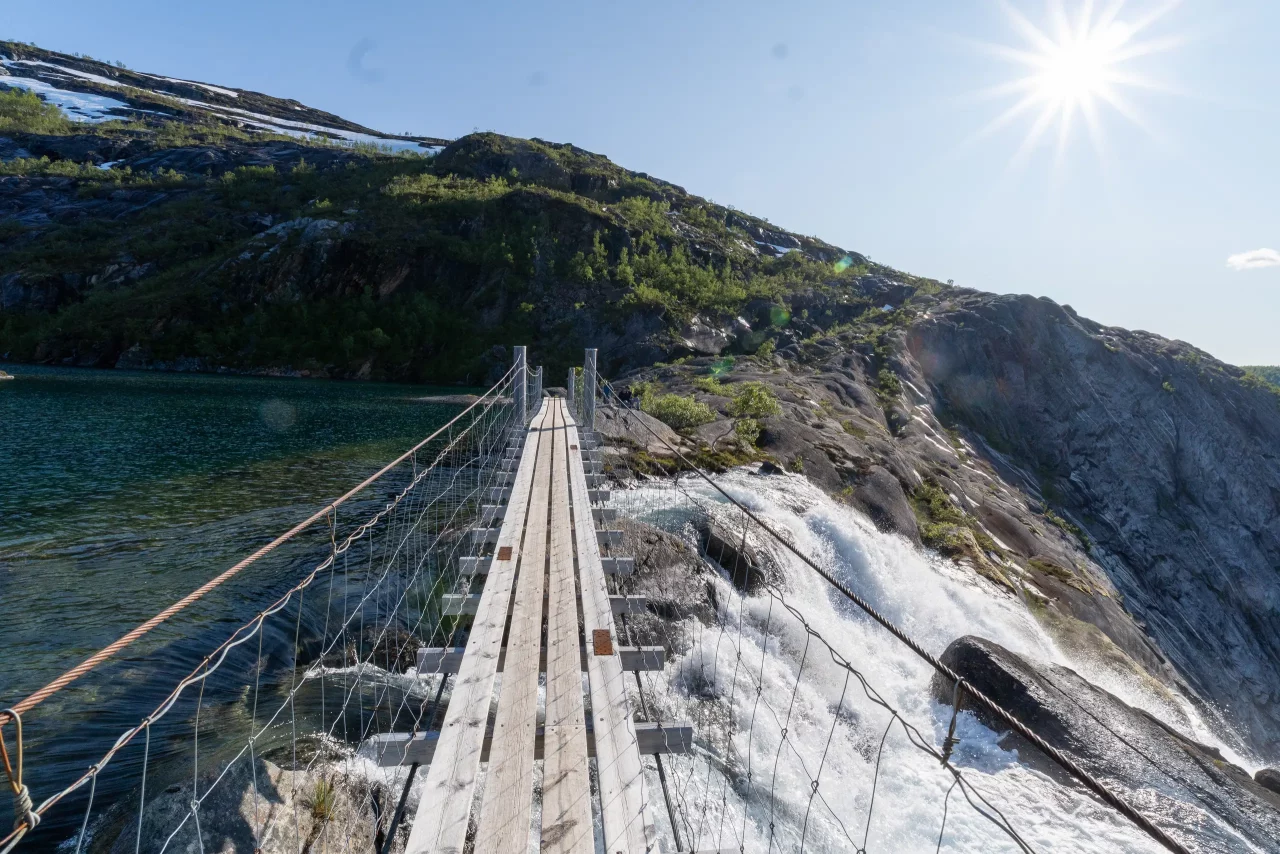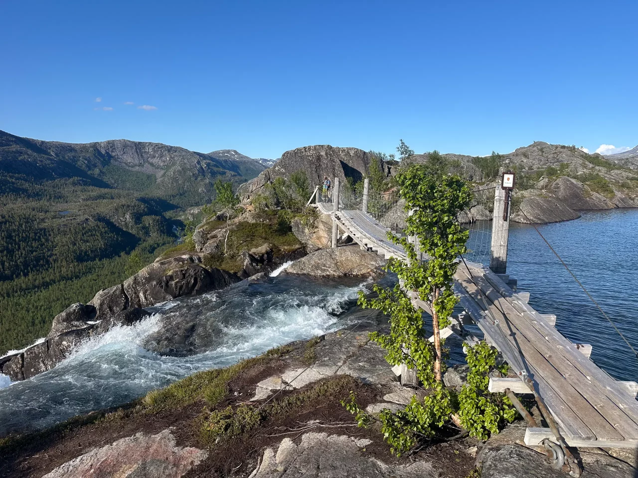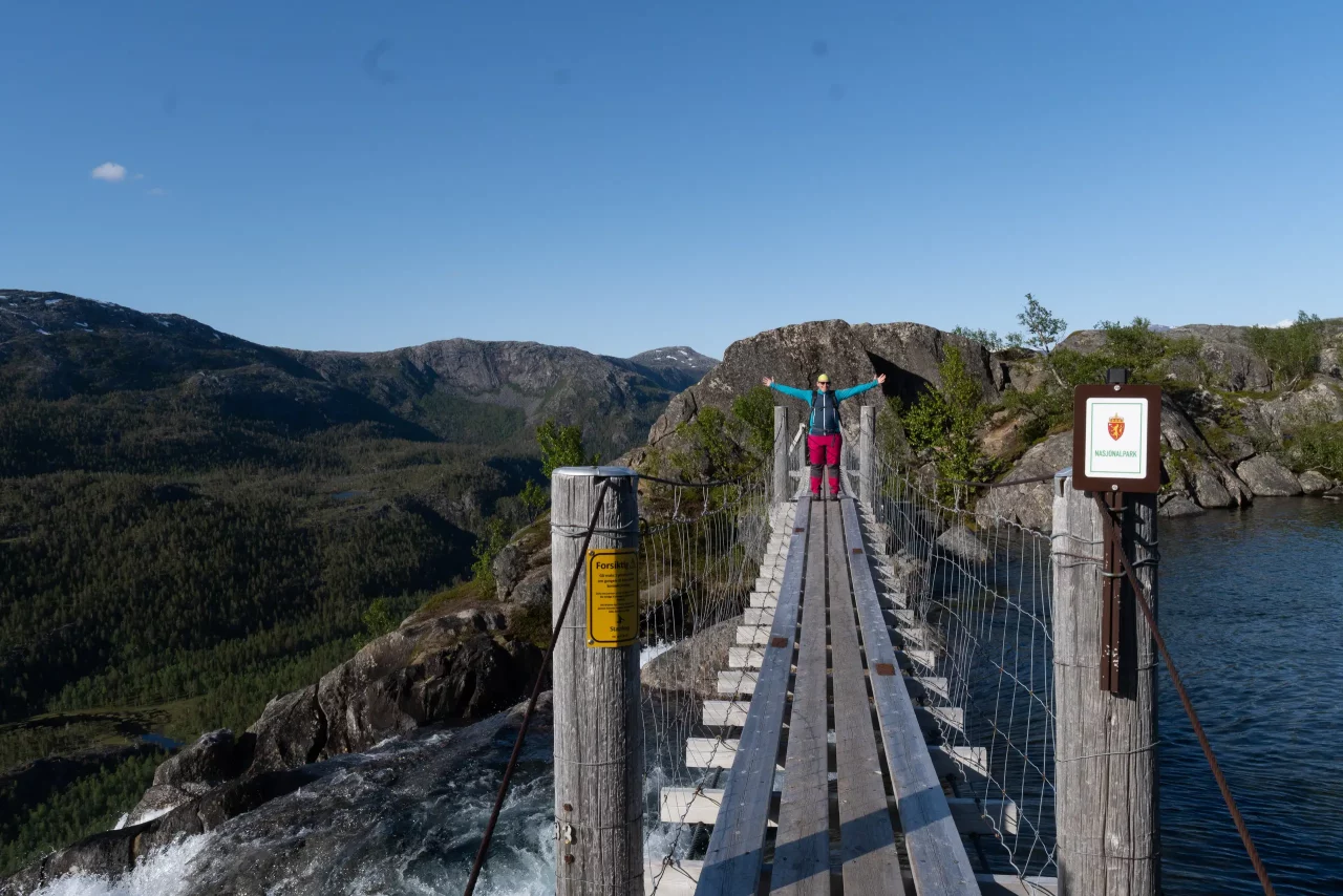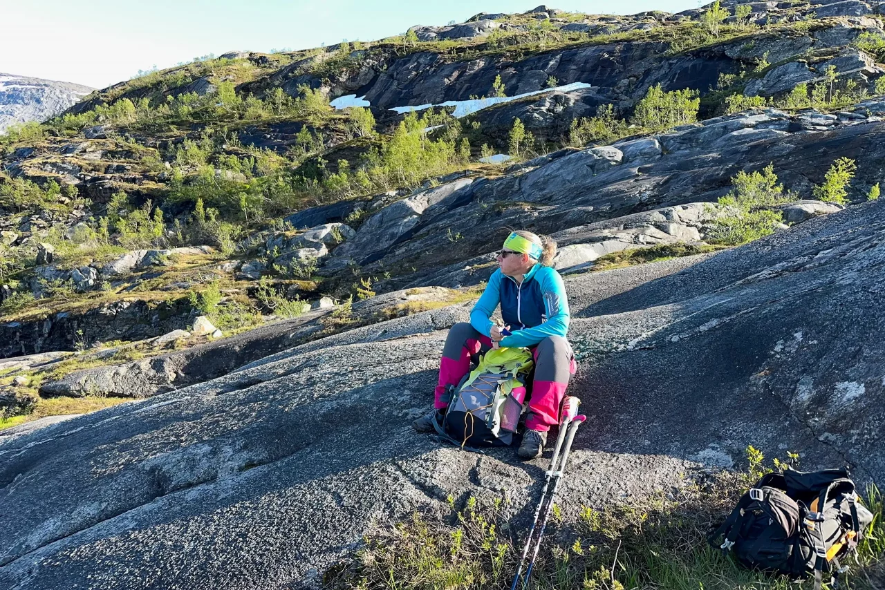 Rago Nationalpark Morgenspaziergang zu den FelsmalereienPerfekter PlatzSteiler Anfang der Tourüber SchneefelderImmer steil nach obenRast am PlateauDas ist Landschaft in NorwegenÜber diese Brücke musst (kannst) du gehen!Einer drübenPerspektiveHeldinvölligst platt