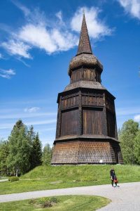 07.30 Uhr. Gut geschlafen. War sehr ruhig. Zum Frühstück gibt es den Rest des Brotes das wir gestern gekauft haben. Dann starten wir Richtung Ostküste Nationalpark Skuleskogen. Die ersten 20 km stellen wieder einmal eine Herausforderung da. Die Strasse ist mit unzähligen Schlaglöchern zwar in Reparatur….. aber da ist noch einiges zu tun. Karsten hält locker durch und unsere Bandscheiben auch. ald geht es auf besserer Strasse weiter. Nach ca. 1,5h sehen wir am Strassenrand ein Hinweisschild auf einen Naturpark und ein Naturum (Waldmuseum und Naturerlebniszentrum ) am Straßenrand. Wir halten an und schauen uns das ganze an. Weil es so schön ist lassen wir uns von der Dame im Naturum einen kleinen Spaziergang entlang des Parks und dann durch das Ort zurück erklären. Im Ort ist ein eindrucksvoller Holzglockenturm an der Kirche und nebenan ein Fest der Gemeinde mit Ständen und Musik.