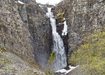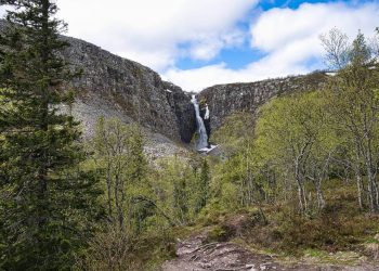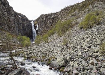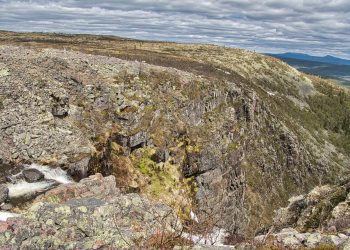. Leider können wir nicht bis ganz an den Wasserfall laufen da der Bohlenweg erneuert wird. Aber auch aus der Ferne ist er eindrucksvoll. Danach geht es weiter den Berg hinauf. Absolut klasse hier. Anspruchsvolles Gelände, Felsen und Geröll. Oben ist es, schwer auszudrücken…. Unwirklich! ….. Es ist eine große Ebene und dann eine gewaltige Abbruchkante an der das Wasser hinab stürzt. Ringsum alles voller großer Geröllbrocken und der Weg ist mit orangen Farbmarkierungen gekennzeichnet. Es ist sehr beschwerlich zu laufen und es erklärt sich der Hinweiß auf gute Trittsicherheit. Kurz hinter dem Wasserfall teilt sich der Weg und wir beschließen noch zu einer kleinen Schleife über das Hochplateau. Inmitten des Gebiets ist ein großer See und auf einer Landzunge stehen einige Hütten. Als wir dort ankommen sehen wir das man die Hütten mieten kann. Auch eine kleine Rezeption und Kiosk gehört dazu. Dort kommen wir mit einer jungen Frau ins Gespräch die dort mit ihrem Freund die Hütten betreut. Wir bekommen einen Kaffee und als ich bezahlen will und leider keine Kronen habe erwidert sie wir könnten gerne mit Kreditkarte zahlen das wäre sowieso besser. Unglaublich….. ich zahle mitten im Nirgendwo meinen Kaffee kontaktlos mit Kreditkarte….. in Deutschland undenkbar
