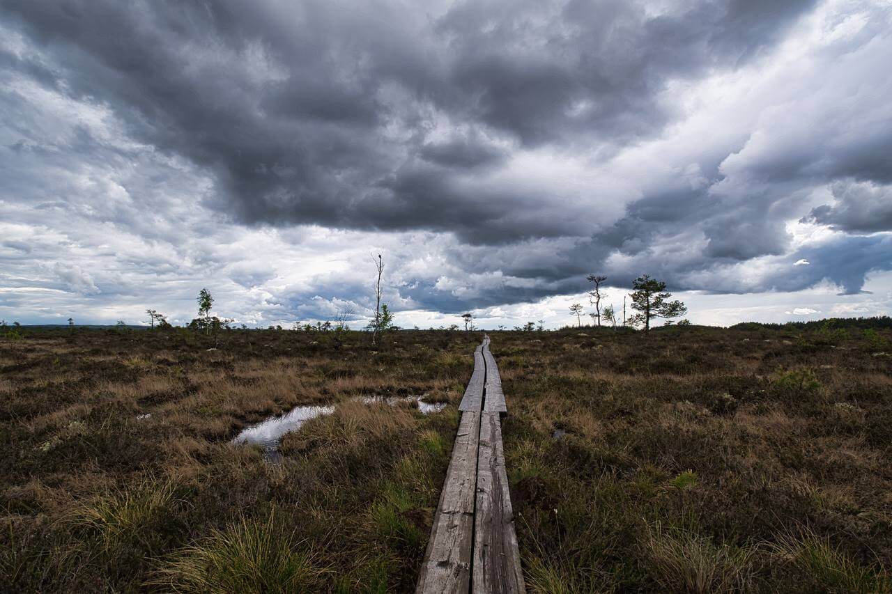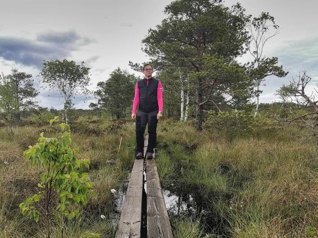 . Es ist eine sensationelle Runde durch die Moorlandschaft. Wir laufen kilometerlang über Holzbohlen. Unterwegs beginnt es leicht zu regnen. Es ist eine einsame und auch „gruselige“ Landschaft sind im Hinterkopf doch Geschichten über die Gefahren von Mooren verankert. Zwischendurch führt der Weg durch einen Kiefernwald einen Hügel hoch und entlang dieses Hügels. Am Ende lesen wir das der Hügel eine Sanddüne mitten im Moor ist. Schon speziell! Als wir nach gut 3,5h wieder an Karsten ankommen sind wir beide geschafft. Die „bequem machbare Runde“ waren über 13km!!
