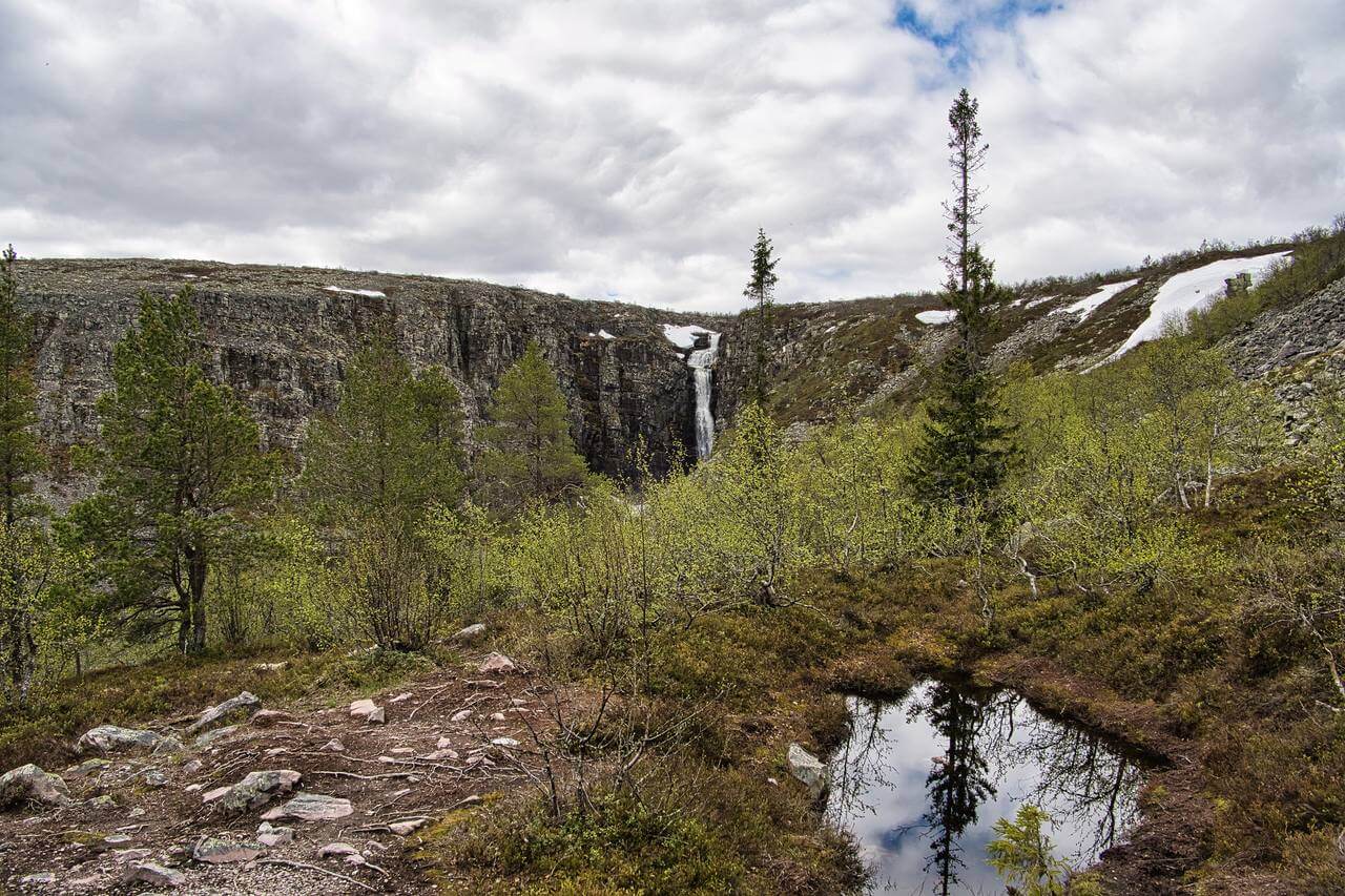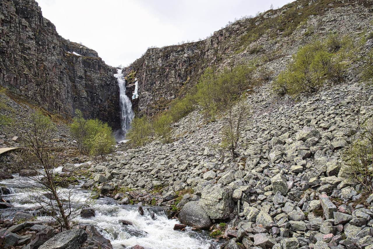 . Leider können wir nicht bis ganz an den Wasserfall laufen da der Bohlenweg erneuert wird. Aber auch aus der Ferne ist er eindrucksvoll. Danach geht es weiter den Berg hinauf. Absolut klasse hier. Anspruchsvolles Gelände, Felsen und Geröll. Oben ist es, schwer auszudrücken…. Unwirklich! ….. Es ist eine große Ebene und dann eine gewaltige Abbruchkante an der das Wasser hinab stürzt. Ringsum alles voller großer Geröllbrocken und der Weg ist mit orangen Farbmarkierungen gekennzeichnet. Es ist sehr beschwerlich zu laufen und es erklärt sich der Hinweiß auf gute Trittsicherheit. Kurz hinter dem Wasserfall teilt sich der Weg und wir beschließen noch zu einer kleinen Schleife über das Hochplateau. Inmitten des Gebiets ist ein großer See und auf einer Landzunge stehen einige Hütten. Als wir dort ankommen sehen wir das man die Hütten mieten kann. Auch eine kleine Rezeption und Kiosk gehört dazu. Dort kommen wir mit einer jungen Frau ins Gespräch die dort mit ihrem Freund die Hütten betreut. Wir bekommen einen Kaffee und als ich bezahlen will und leider keine Kronen habe erwidert sie wir könnten gerne mit Kreditkarte zahlen das wäre sowieso besser. Unglaublich….. ich zahle mitten im Nirgendwo meinen Kaffee kontaktlos mit Kreditkarte….. in Deutschland undenkbar