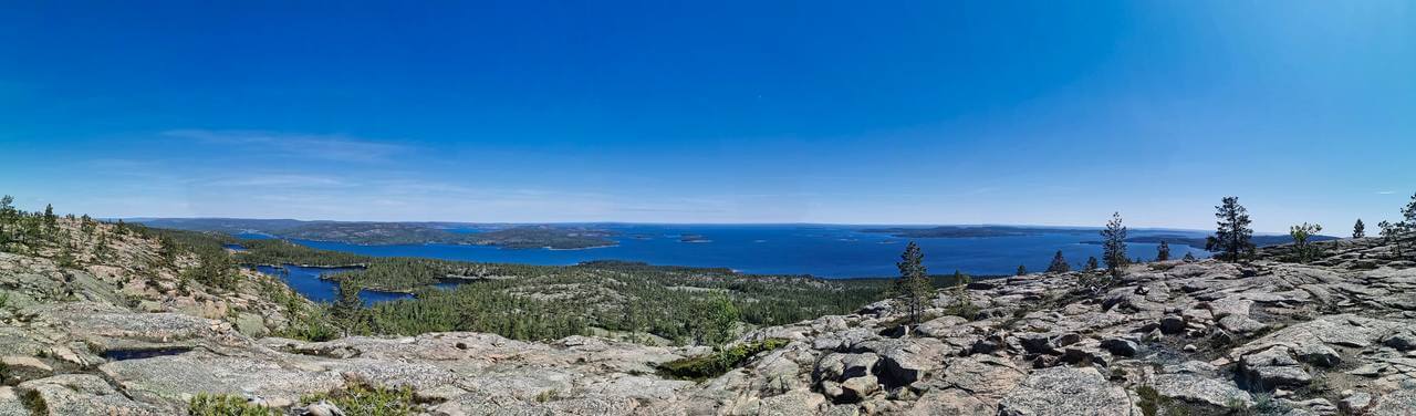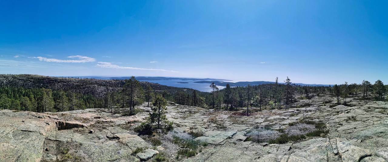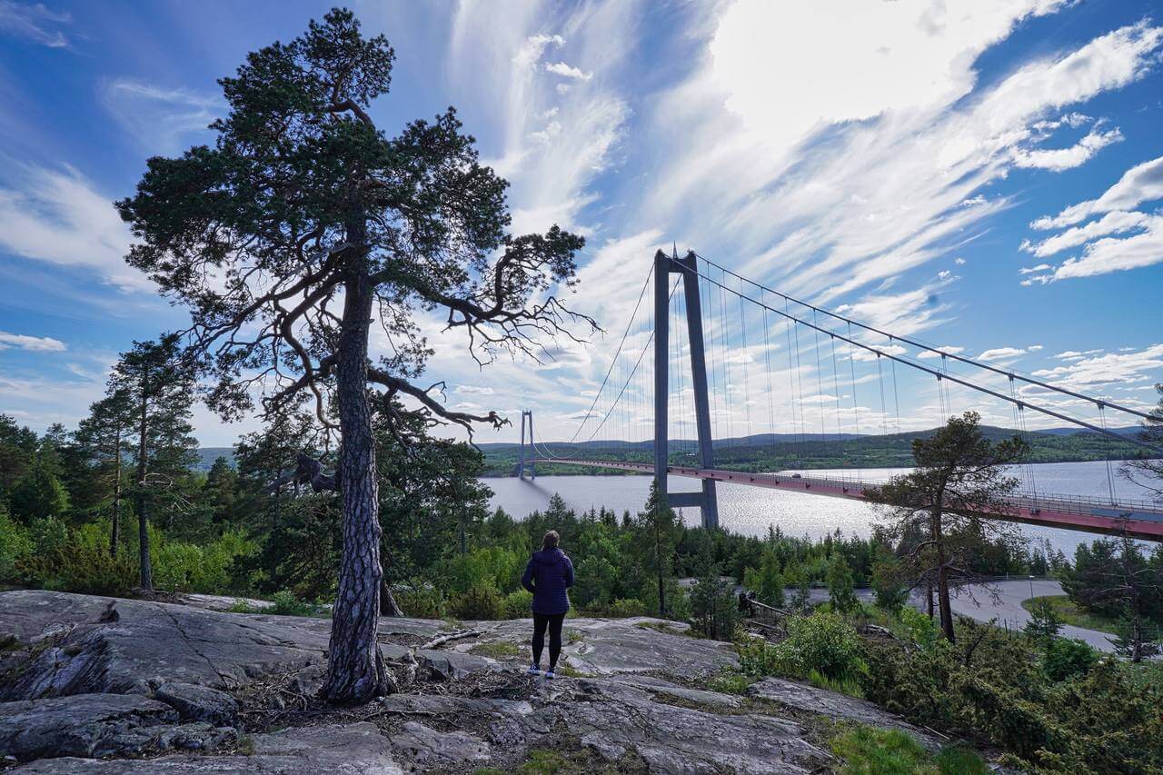 Wir fahren weiter um dann über die Högakustenbron ( Hohe Küstenbrücke – Höchste Hängebrücke Schwedens, Pfeilerhöhe 180m, Spannweite 1210m ) ins Landschaftsgebiet Höga Kusten („die Hohe Küste“) zu fahren. Hinter der Brücke auf einem Parkplatz fahren wir raus und parken. Von dort wandern kurz zu der Aussichtsstelle den Berg hoch. Traumhaftes Panorama bei strahlendem Sonnenschein.