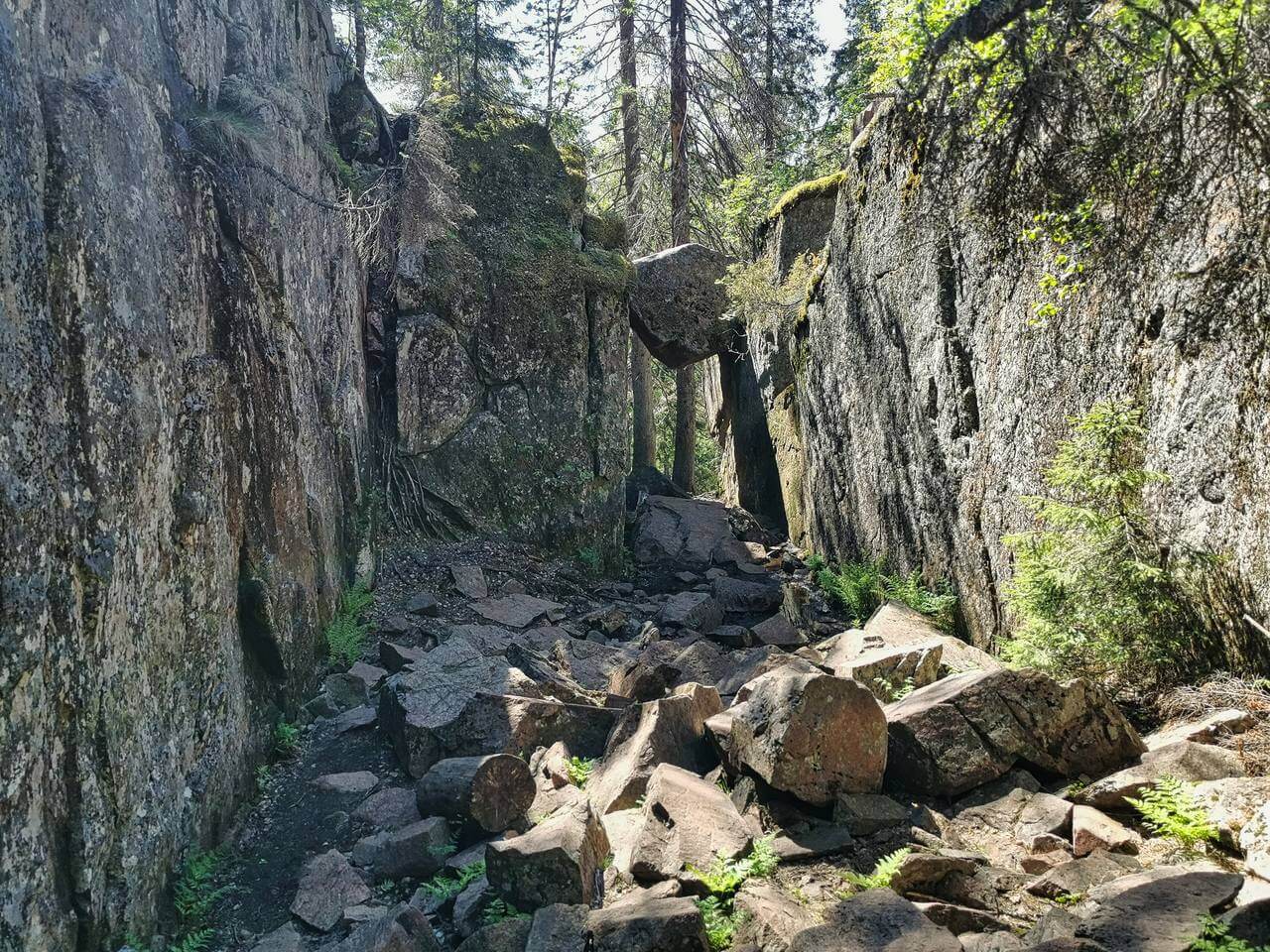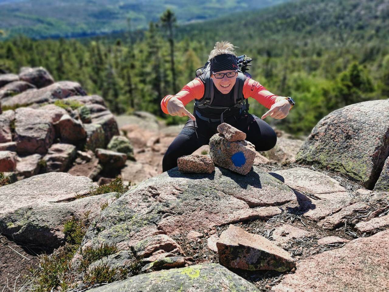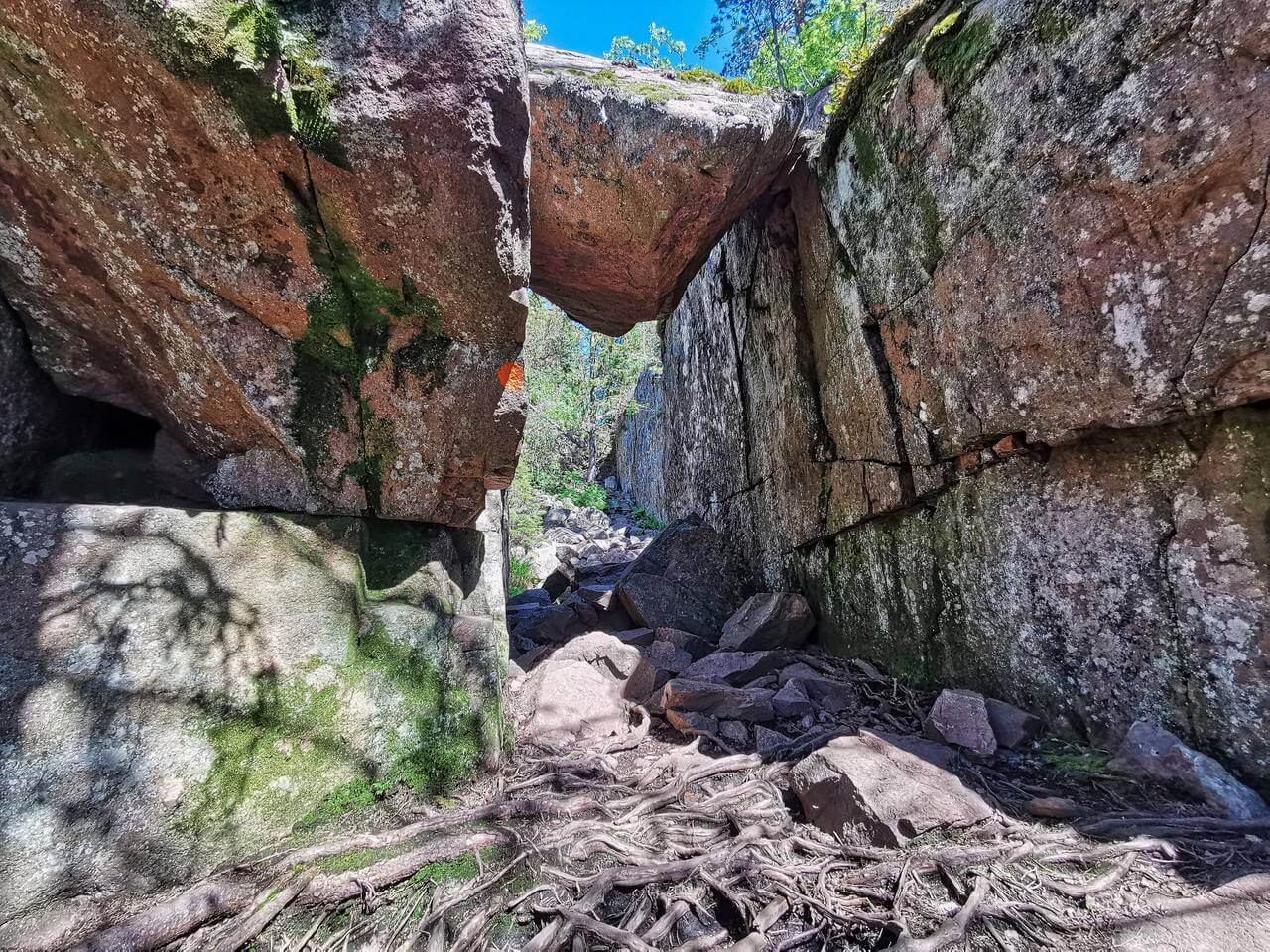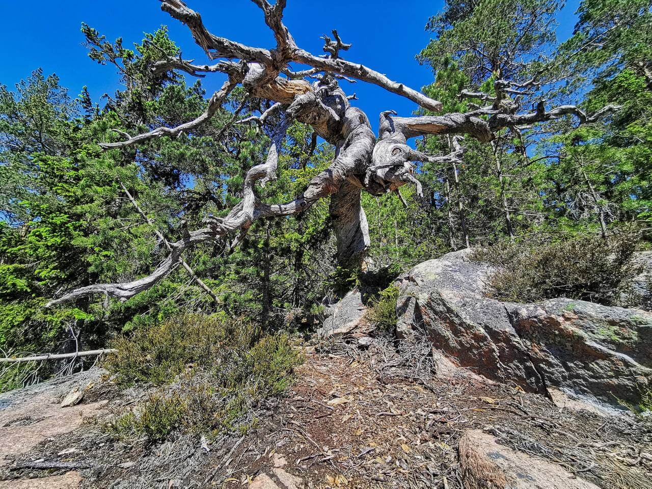 07.30 Uhr Start in den Tag. Heute ist Schwedische Nationalfeiertag, ähnlich dem Amerikanischen 4.Juli. Die Nacht war völlig entspannt und ruhig. Nach dem Frühstück starten wir unsere Wanderung durch den Skuleskogen Nationalpark. Ab dem ersten Meter ist diese Wanderung unglaublich. Führt sie über Stege, Wurzeln und Felsen erst mal zu einem See an dem eine Hütte steht. Diese kann man reservieren und dort locken mit 6-8 Personen übernachten. Vor der Hütte ist eine Feuerstelle und hinten ein Verschlag mit Brennholz. Das haben wir in den Parks jetzt schon öfter gesehen 👍🏻 . Weiter führt der Weg zur Slättdalskrevan, eine unglaubliche Schlucht und dann auf den Slättdalsberget von dem wir ein fantastisches Panorama über die naheliegend Küste haben. Jetzt folgt aber erst ein besonderes Highlight. Einzuordnen unter „eigene Dummheit“ Ich hab die Speicherkarte nach der gestrigen Datensicherung nicht in die Kamera zurück gesteckt. Da schleppt man 2 kg Kameraequipment durch die Landschaft und kann sie wegen fehlender 20g nicht nutzen. Das Ärgerlichste daran ist, ich kann es nicht mal Silke in die Schuhe schieben…..😫 Weiter, immer den blauen Punkten nach. Ohne diese würden wir uns komplett verirren und wahrscheinlich nie mehr zurück finden. Es geht über Geröllfelder und immer den Punkten nach. Nach 7,35h und 21km sind wir wieder bei Karsten angekommen. Die letzten 3km war Silke am Limit aber durchgekommen. Mir ging es nicht besser.