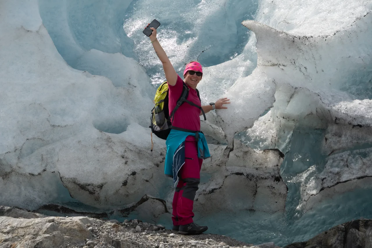 Ab jetzt geht’s im Zickzack über massiven, glatten Fels. Der Gletscher zum Greifen nah – aber irgendwie zieht sich der Aufstieg ewig hin. Hier ist definitiv Kondition und Trittsicherheit gefragt! Die Felslandschaft ist absolut faszinierend – geformt und geschliffen vom Gletscher selbst. Nach gut zwei Stunden sind wir endlich oben. Ich war vor zwei Jahren schon mal hier, und beim Vergleich der Fotos sieht man deutlich: Der Gletscher wird kleiner!