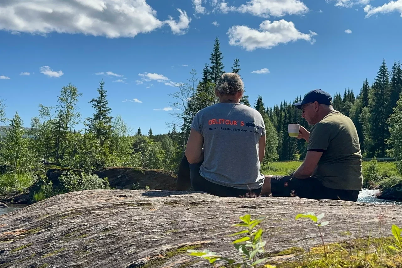 Mittags machen wir Rast mit einem kleinen Spaziergang an einem Wildwasser – dann geht’s weiter. Gegen 18:30 Uhr suchen wir uns einen Stellplatz am Trondheimfjord.