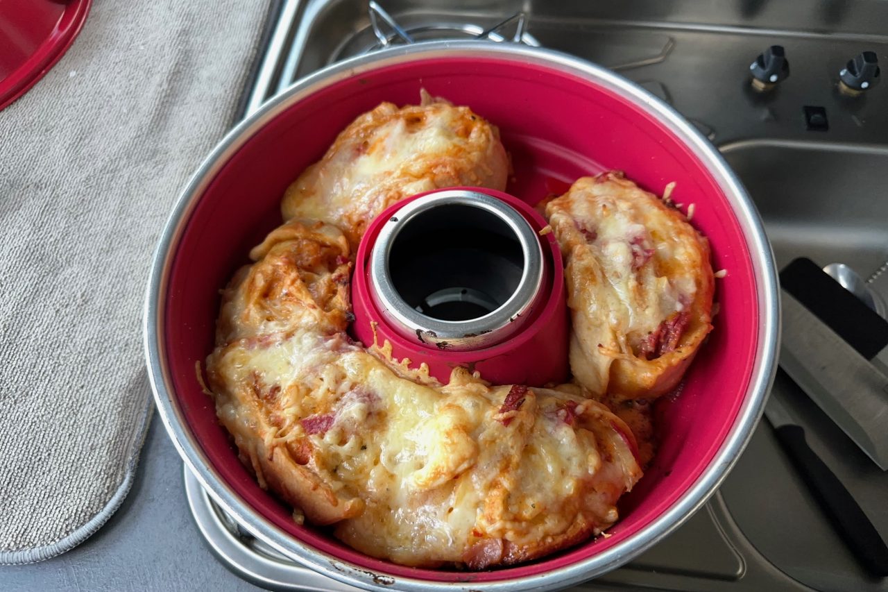 Gegen 19:30 Uhr suchen wir uns einen Stellplatz. Zum Abendessen probieren wir mal Pizza aus dem Omnia-Backofen … schmeckt 👍🏻