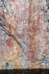 Nach einer Weile hört es auf zu regnen, und ich gehe weiter. Kurz hinter der Hütte führt eine Plattform an eine Felswand – von dort aus lassen sich die Malereien gut erkennen. Ihr Alter wird auf 3.500 bis 7.000 Jahre geschätzt. Schon faszinierend, wie lange das überdauert hat!