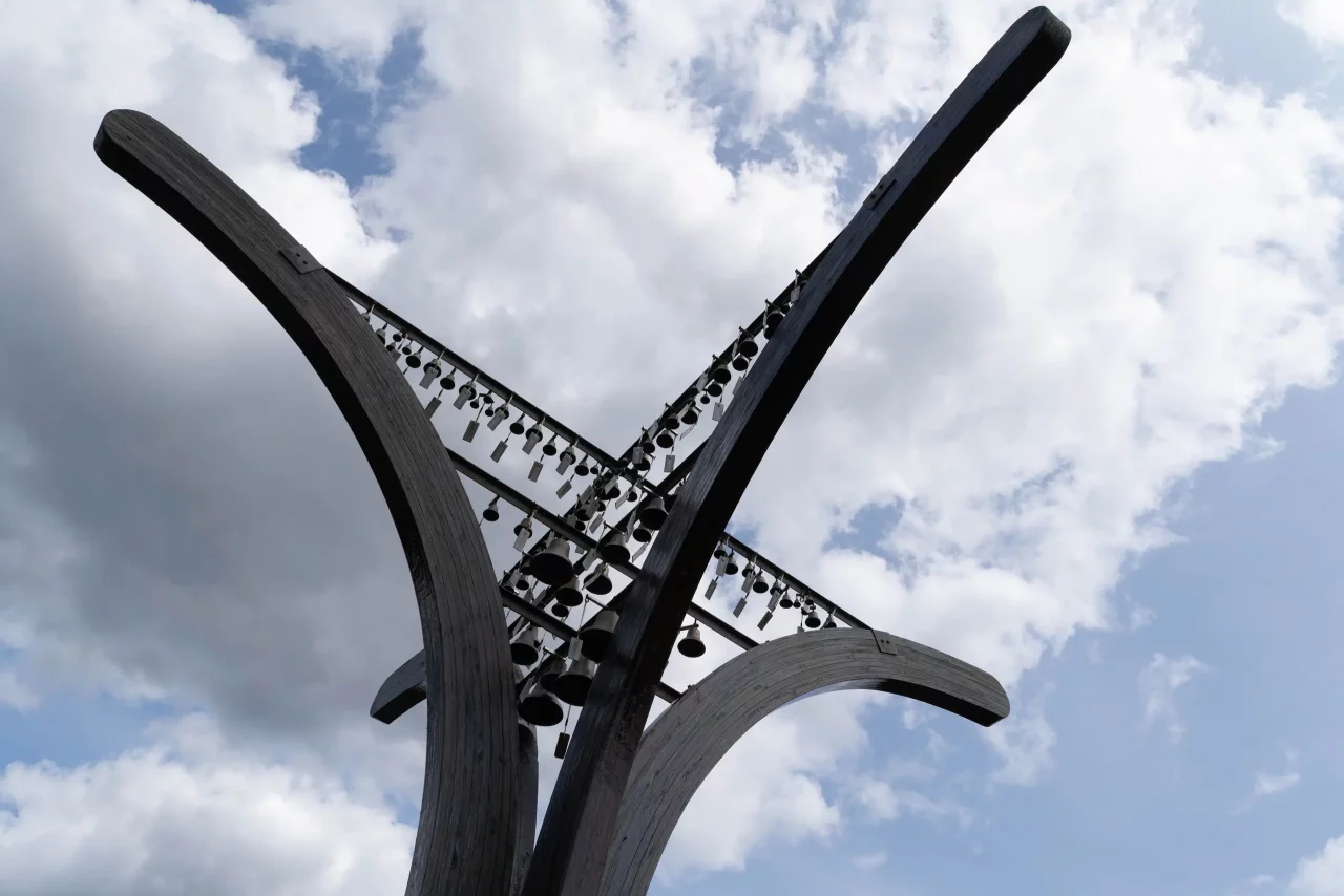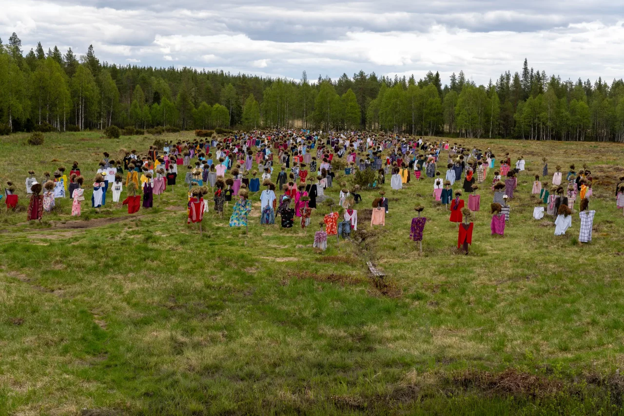 Es sind ca. 1000 Gestelle mit Köpfen aus Torf, die alle in eine Richtung schauen. Zweimal im Jahr werden sie von einem Verein aus dem Nachbardorf passend zur Jahreszeit eingekleidet.