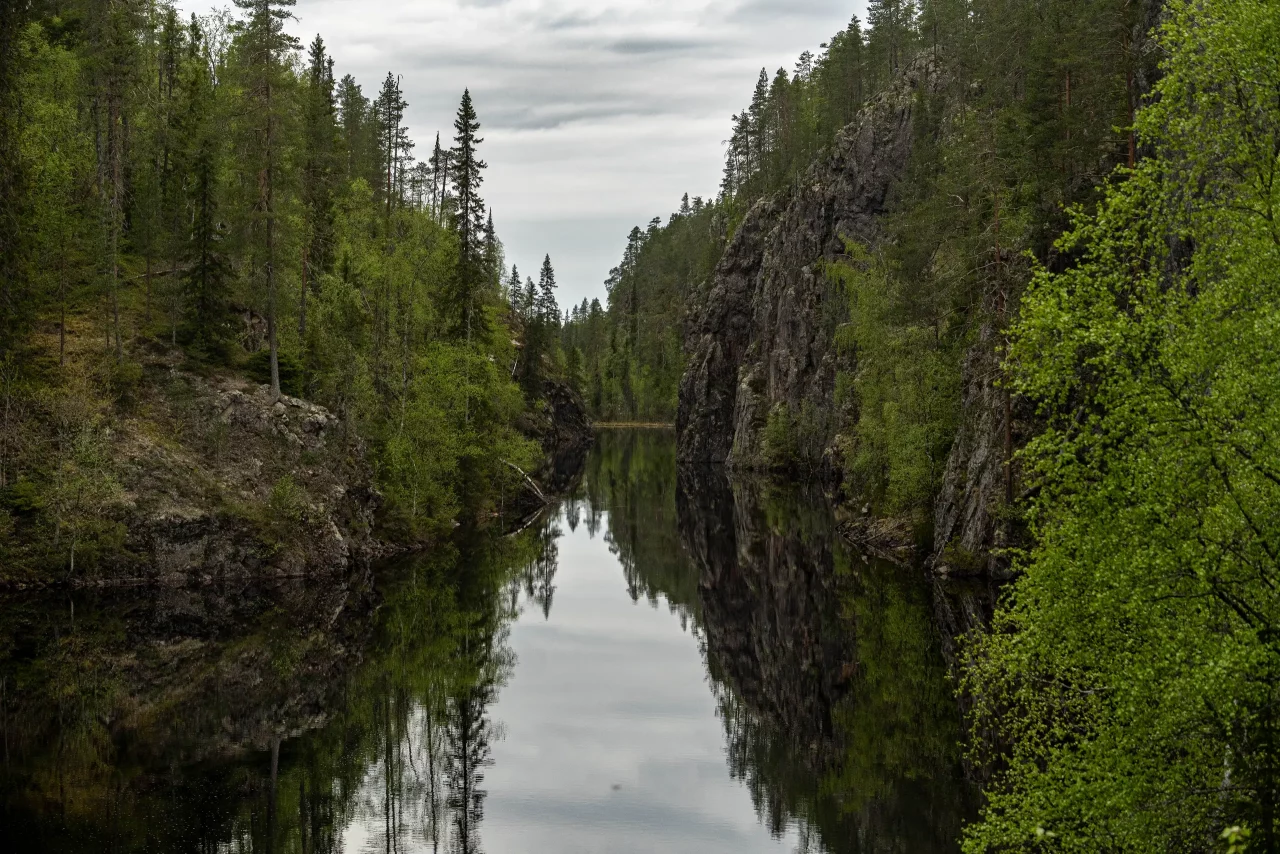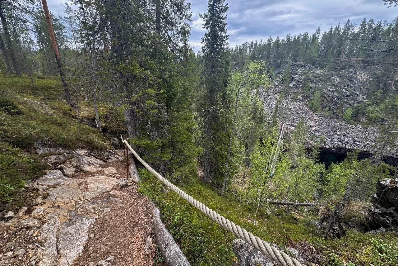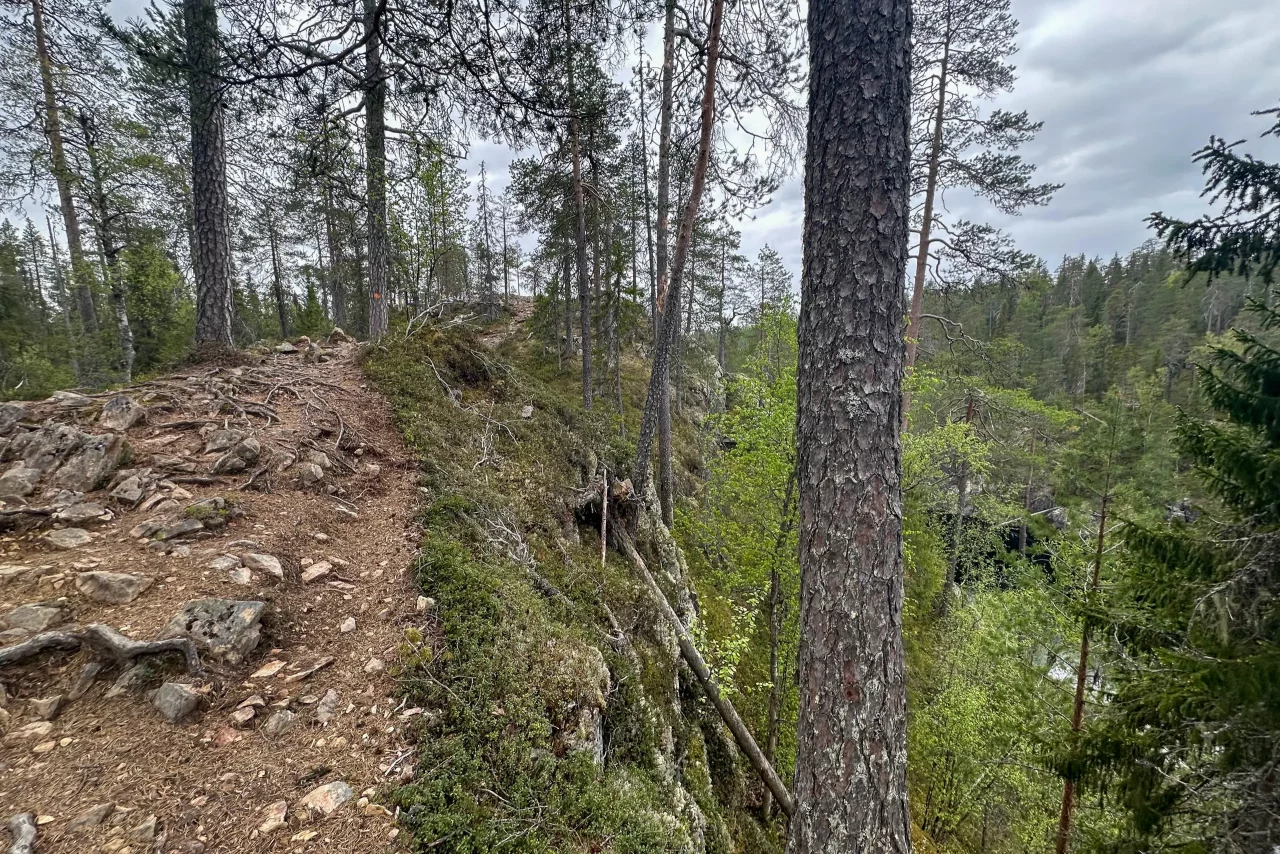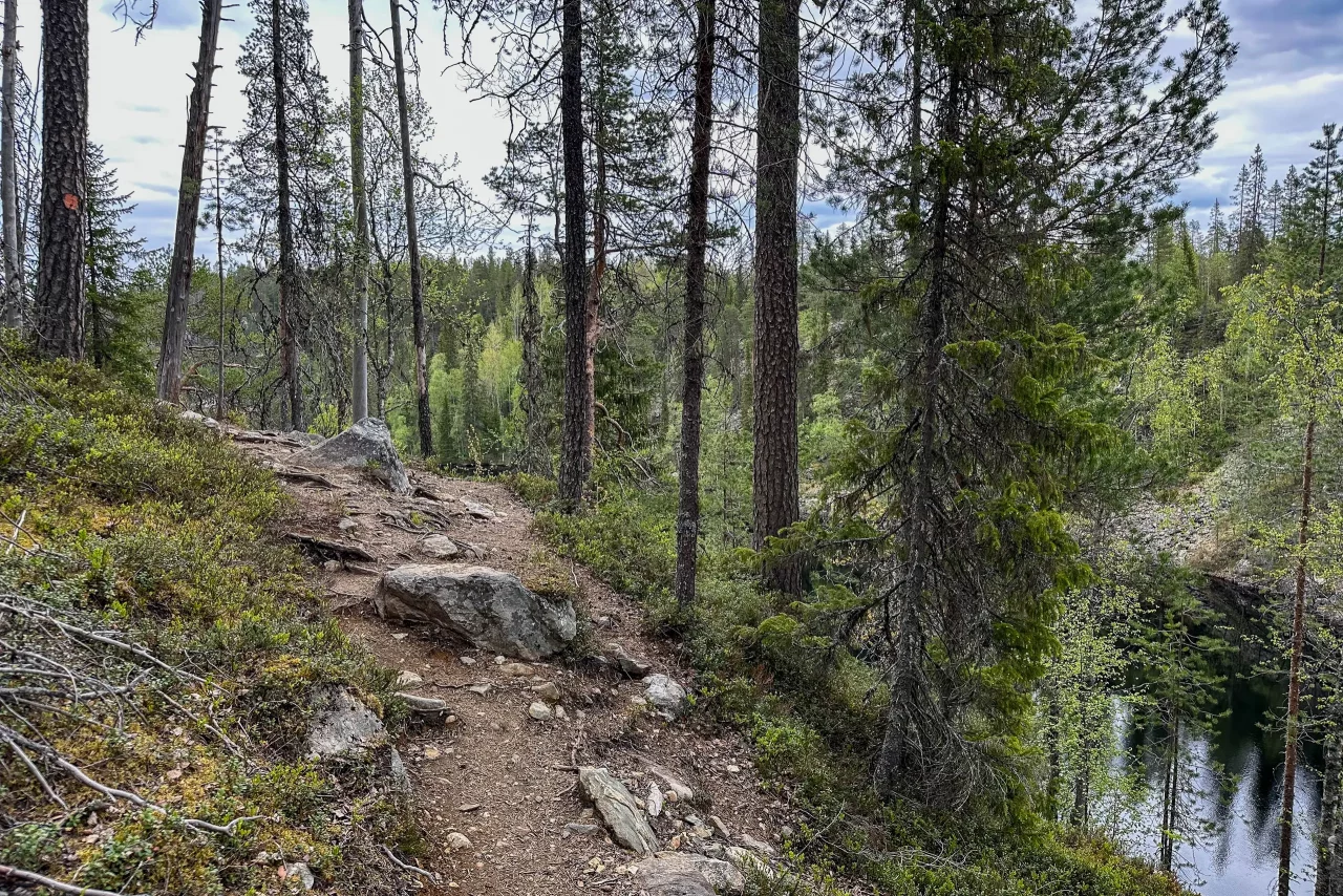 Ich fahre weiter, will noch zum Julma-Ölkky, dem größten Schluchtensee Finnlands. Nach knapp 15 km bin ich da, ziehe die Wanderschuhe an – mal kurz hin, zwei Fotos und weiter… Denkste! Drei Rundwege stehen zur Auswahl: 4,7 km, 9 km oder 10 km. Kein Problem – muss ja nur vor dem Dunkelwerden zurück sein. Ach ja… es wird ja gar nicht mehr dunkel 😜