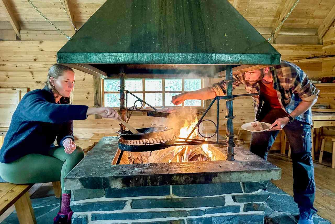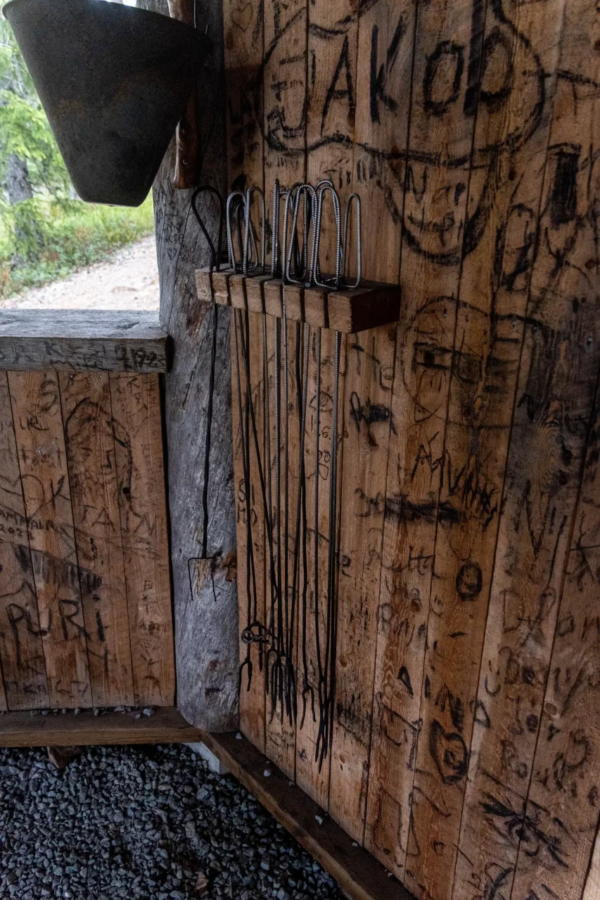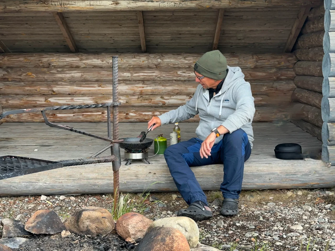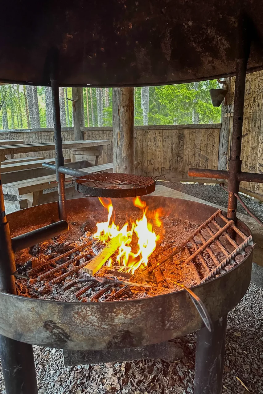 Ich quere die Bikerunde von gestern und komme nach gut 4,5 km an einem See an – na ja, wo auch sonst in Finnland, gibt hier ja genug davon! In einer Grillhütte glimmen noch die Reste eines Lagerfeuers. Nachdem ich ein, zwei Holzscheite nachlege, kann ich mich etwas aufwärmen und unterstellen – es regnet nämlich gerade. Zum Grillen wäre alles da, nur mein Müsliriegel passt da nicht ganz ins Konzept.