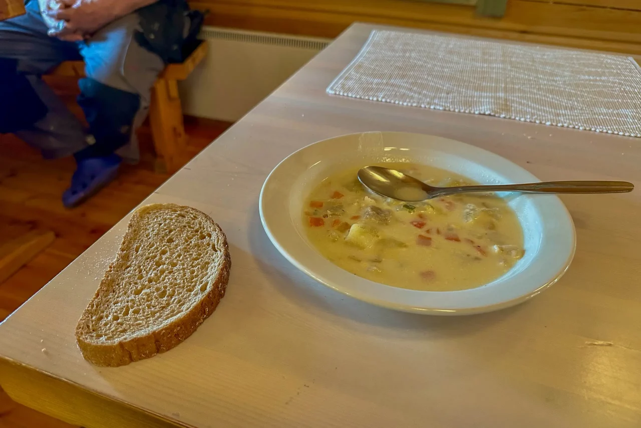 Gegen 13:00 Uhr bin ich wieder zurück am Campingplatz. Als ich im Office noch eine Nacht verlängere, werde ich herzlich zum Mittagessen eingeladen. Es gibt hausgemachte karelische Fischsuppe! Es wäre sehr unfreundlich, abzulehnen – und so esse ich todesverachtend eine Portion… und überlebe entgegen aller Erwartungen. Um allen Nachfragen zuvorzukommen: Es war ok – aber nichts, was ich brauche. 😅