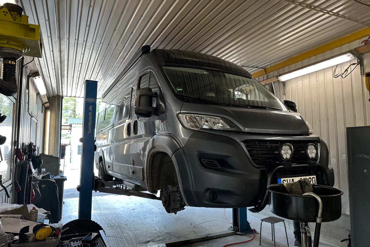 Die Mechaniker sind super: freundlich und absolut hilfsbereit. Karsten ist so freundlich, beim ersten Test ausgiebig zu quietschen, sodass das Problem gleich hörbar ist. Nach einiger Zeit kristallisiert sich der Keilriemen heraus, der die Lichtmaschine antreibt. Die Batterie wird ungleichmäßig geladen. Da fällt mir ein, dass ich unterwegs in Polen mal kurz eine Fehlermeldung in meiner Batterieanzeige hatte – die aber kurz darauf wieder verschwunden war. Anscheinend hat der Riemen ein Problem, es wird ein neuer bestellt und morgen Mittag ausgetauscht.