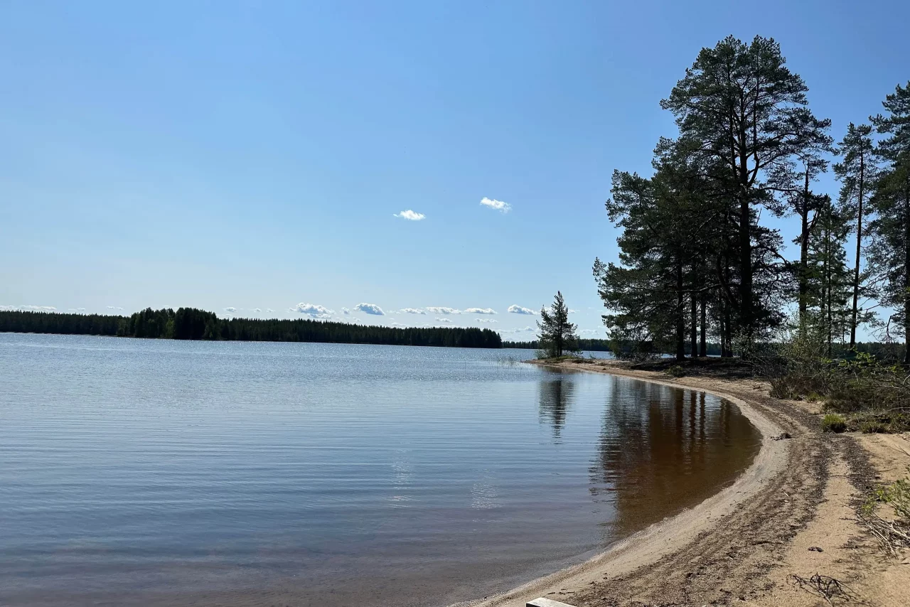 Bestes Wetter heute. Gestern habe ich in der Nähe meines Übernachtungsplatzes einen kleinen Sandstrand entdeckt – und da die Sonne scheint, geht es erst mal zum Baden. Traumhafte Kulisse: Sandstrand, eine Saunahütte mit Sitzbank und Ruhe. Hier ist sonst niemand. Nachdem ich einige Minuten schwimmen war – ja, nur einige wenige, es ist eher nicht warm –, sitze ich noch eine Weile in der Sonne zum Trocknen und gehe anschließend zurück zum Frühstück.
