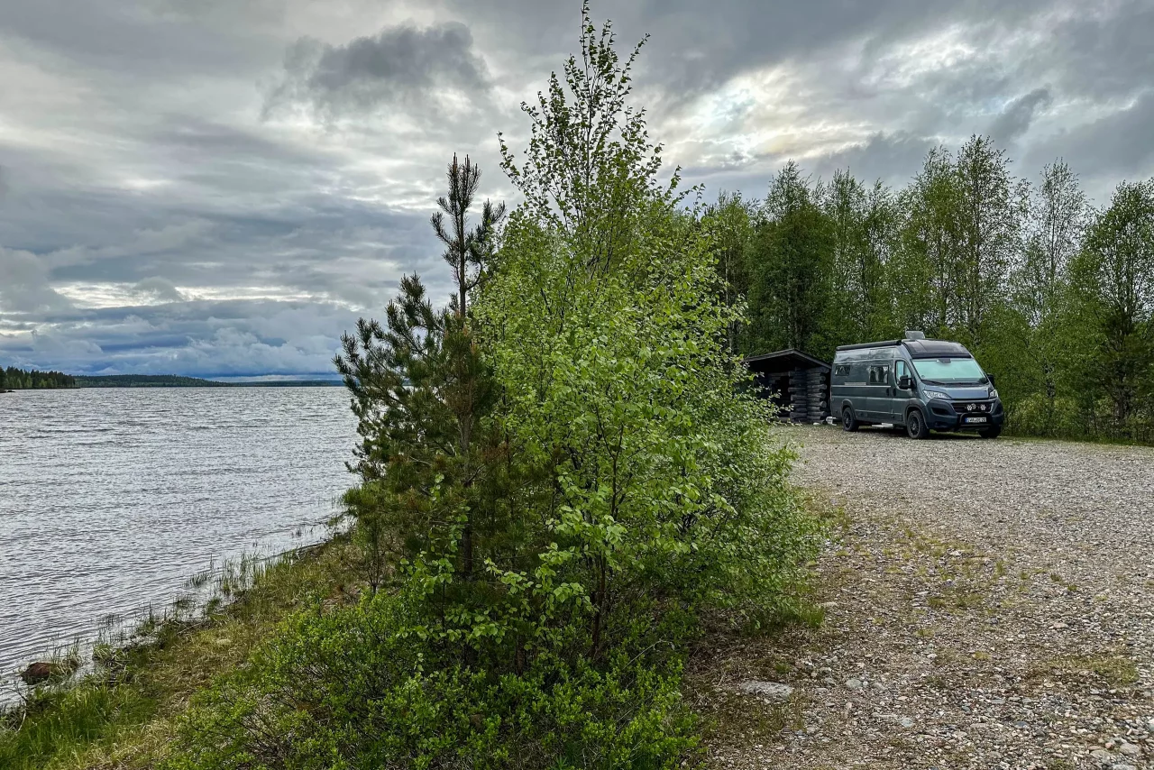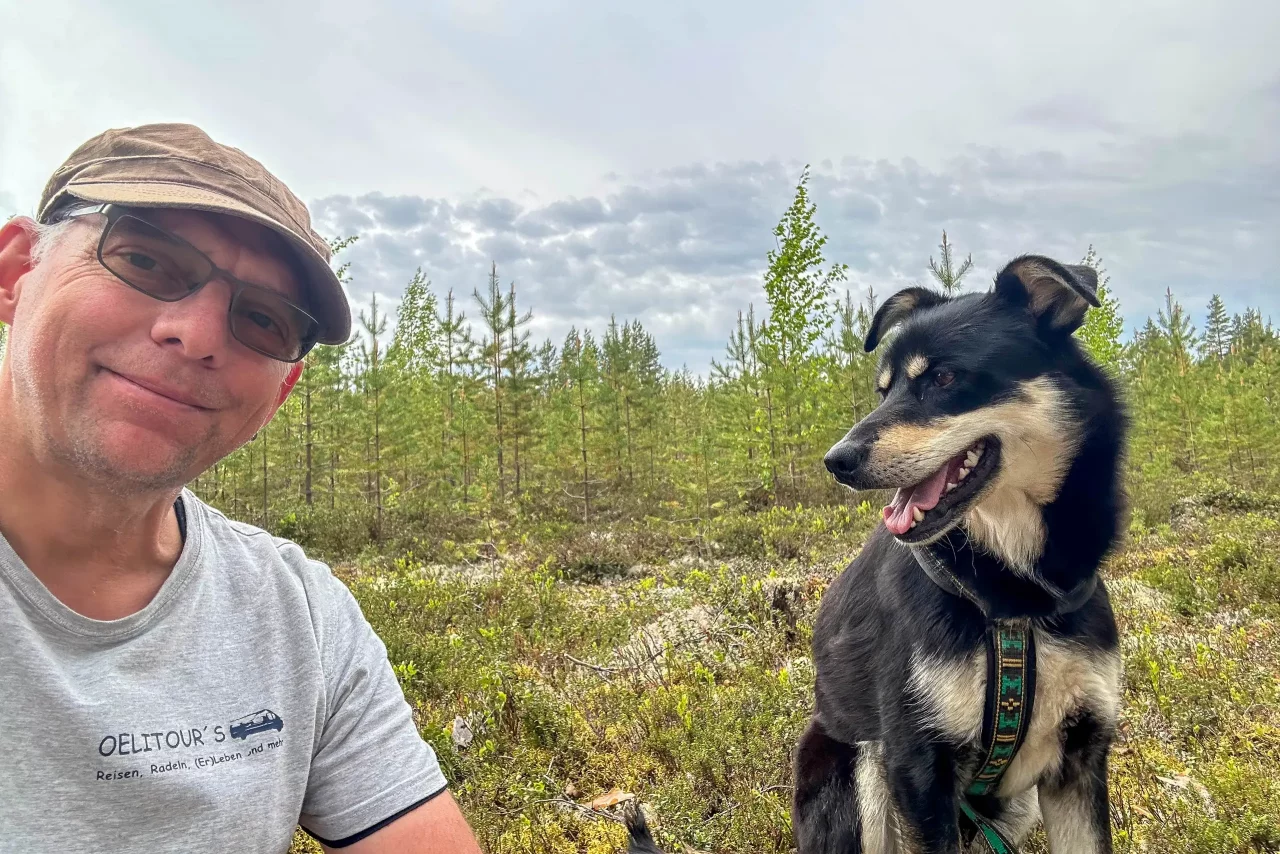 Ich fahre zur Huskiefarm und werde dort sehr herzlich begrüßt. Julian zeigt mir das Gelände, und Karsten darf direkt am See und neben der Sauna stehen. Heute Abend geht’s in die Sauna – und morgen … schau mer mal!