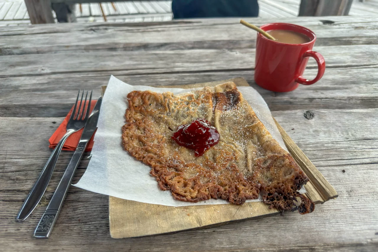 Ich trinke im zugehörigen Café eine Tasse Kaffee und esse einen sehr leckeren Pfannkuchen vom Holzofen – sehr lecker!