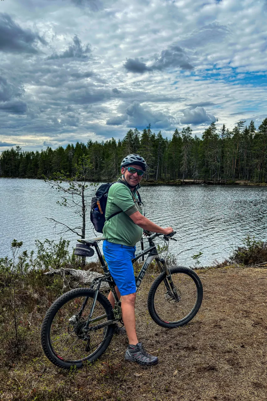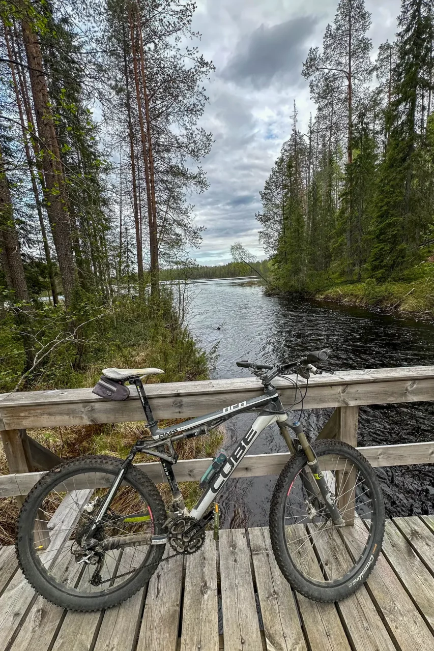 Auf Komoot finde ich eine Mountainbike-Tour. Aber erst muß ich, nachdem ich das Rad vom Träger genommen habe, es erst mal reinigen und ölen – hinten auf Karsten bekommt es unterwegs doch schon einiges ab.🤦🏻♂️ und wieder, wie vor zwei Jahern, einmal ärgere ich mich das ich die Handyhalterung für das Bike nicht mitgenommen habe. Erleichtert das Navigieren doch wenn man eine mit hat!! Und dann: eine sensationelle Tour. Knapp 15 km nur Pfade und Wurzelwege. Die Einstufung „leicht“ möchte ich allerdings zur Diskussion stellen. Ich hatte mehrere Tragestrecken und technisch war die Tour auch nicht ohne! Hat mir unglaublich viel Spaß gemacht. Unterwegs hab ich noch zwei Finnen beim Schlauchwechseln unterstützt und so war ich knapp 1,5 Stunden unterwegs.
