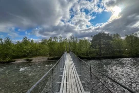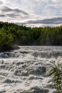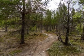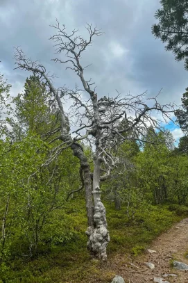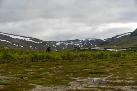 Dann geht’s weiter, tanken, AdBlue auffüllen und ab zum Nationalpark Stabbursdalen. Ich habe mir eine Wanderung zum Stabbursfossen vorgenommen. Um 17:00 Uhr bin ich am Parkplatz, also wieder Schuhe an. Es wird ja eh nicht dunkel – und es regnet nicht. Der Weg ist anfangs ziemlich fordernd: Über große Steine geht’s gut 2 km in einen Pinienwald, dann über eine Hängebrücke weiter hinein in den Nationalpark. Die Bäume werden kleiner, weichen Büschen, und immer wieder kommen Rentiergatter, die man übersteigen oder durchqueren muss.
