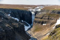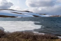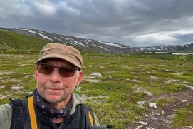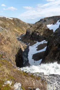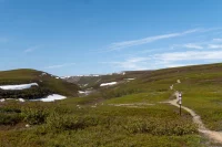 Die Tour ist traumhaft: Diese Weite, der Fjord als blaues Band im Hintergrund, oben auf dem Fjäll noch große Schneefelder – und am Ende ein eindrucksvoller Wasserfall.