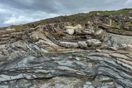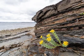 Wieder zurück bei Karsten hole ich das Frühstück nach und fahre weiter an den Porsangerfjord. Auf einem Rastplatz will ich nur schnell Müll loswerden, entdecke aber ein Schild zu einem Geopfad. Also wieder Wanderschuhe an. Der Pfad ist mit roten Holzpflöcken markiert, ein paar Schautafeln – sogar auf Deutsch – erklären die geologischen Besonderheiten der Gegend. Zwischenzeitlich ist es spannend weil die Markierungen eher kreativ verteilt sind. So ziehte ich öfter Bögen, um wieder auf den Weg zu kommen. Das hat sich auch gelohnt!