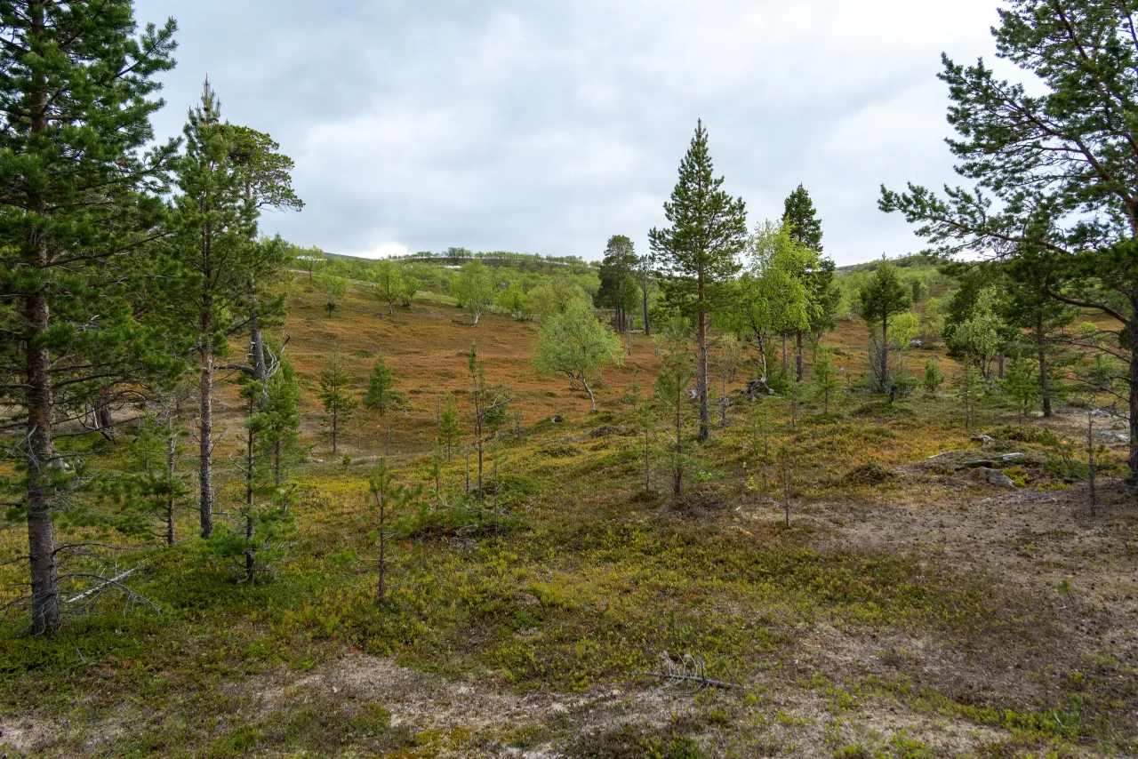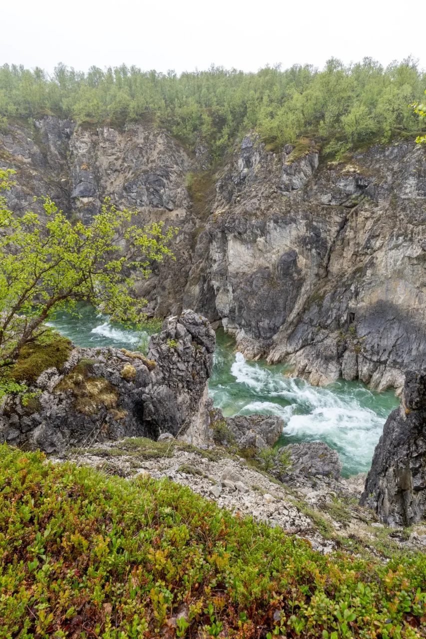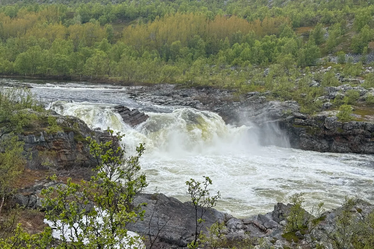 Dann geht’s weiter, tanken, AdBlue auffüllen und ab zum Nationalpark Stabbursdalen. Ich habe mir eine Wanderung zum Stabbursfossen vorgenommen. Um 17:00 Uhr bin ich am Parkplatz, also wieder Schuhe an. Es wird ja eh nicht dunkel – und es regnet nicht. Der Weg ist anfangs ziemlich fordernd: Über große Steine geht’s gut 2 km in einen Pinienwald, dann über eine Hängebrücke weiter hinein in den Nationalpark. Die Bäume werden kleiner, weichen Büschen, und immer wieder kommen Rentiergatter, die man übersteigen oder durchqueren muss.