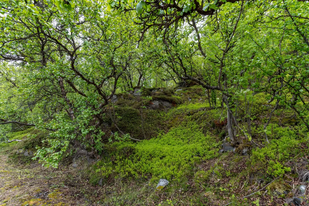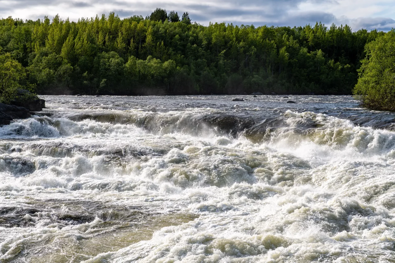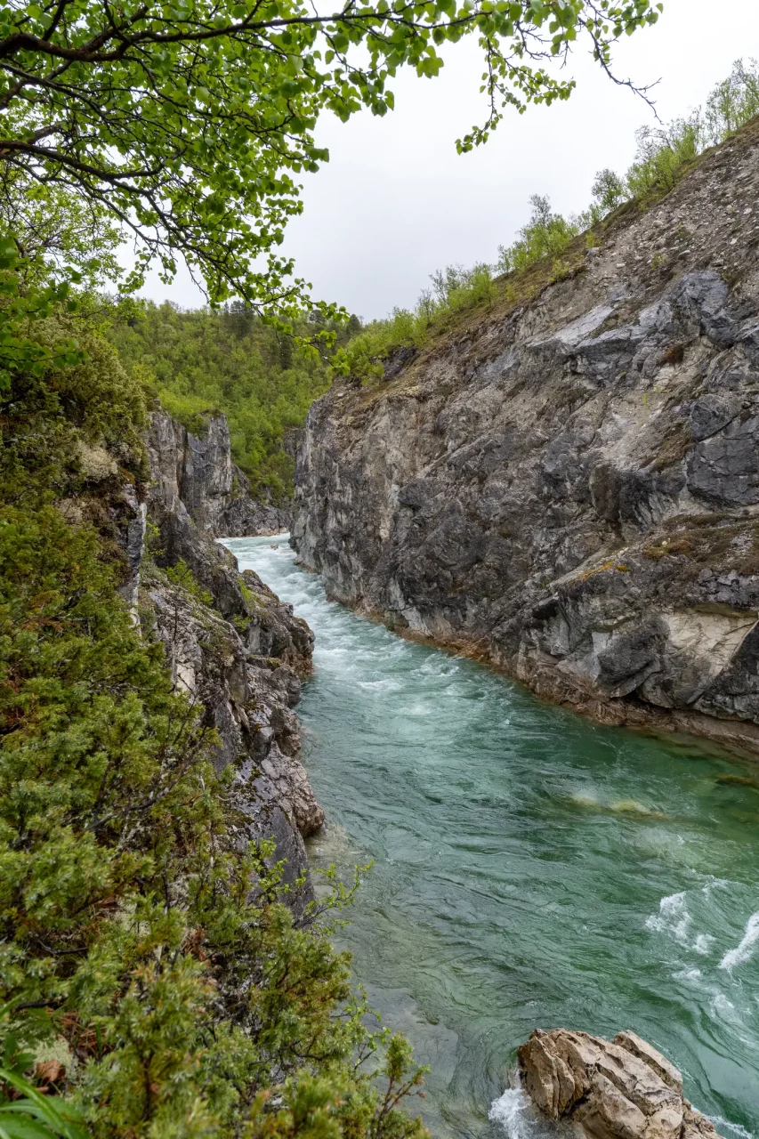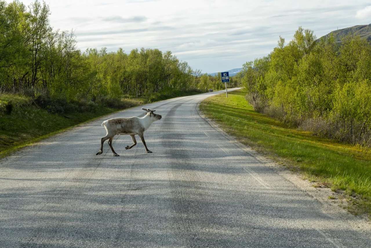 Dann geht’s weiter, tanken, AdBlue auffüllen und ab zum Nationalpark Stabbursdalen. Ich habe mir eine Wanderung zum Stabbursfossen vorgenommen. Um 17:00 Uhr bin ich am Parkplatz, also wieder Schuhe an. Es wird ja eh nicht dunkel – und es regnet nicht. Der Weg ist anfangs ziemlich fordernd: Über große Steine geht’s gut 2 km in einen Pinienwald, dann über eine Hängebrücke weiter hinein in den Nationalpark. Die Bäume werden kleiner, weichen Büschen, und immer wieder kommen Rentiergatter, die man übersteigen oder durchqueren muss.