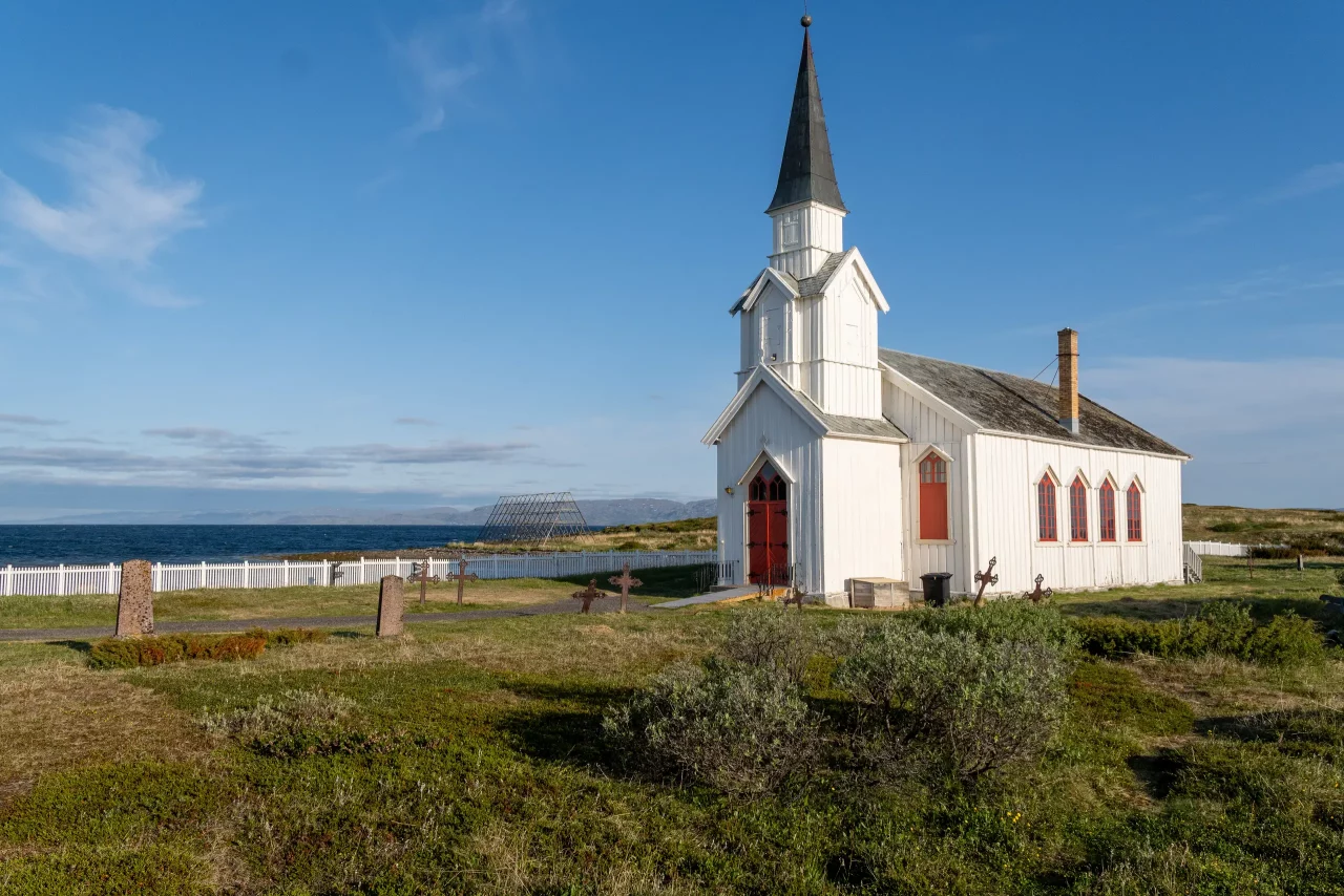 Ich schaffe es noch bis Nesseby, wo ich mir kurz die weiße Kirche anschaue. Die Nesseby-Kirche ist eines der ältesten Gebäude der Region – und das einzige, das die Zerstörung Finnmarks 1944–45 überstanden hat. Laut einer Legende soll der Gemeindepfarrer den deutschen Truppen mit göttlicher Strafe gedroht haben, woraufhin sie die Kirche verschonten. Ob das stimmt? Wer weiß …