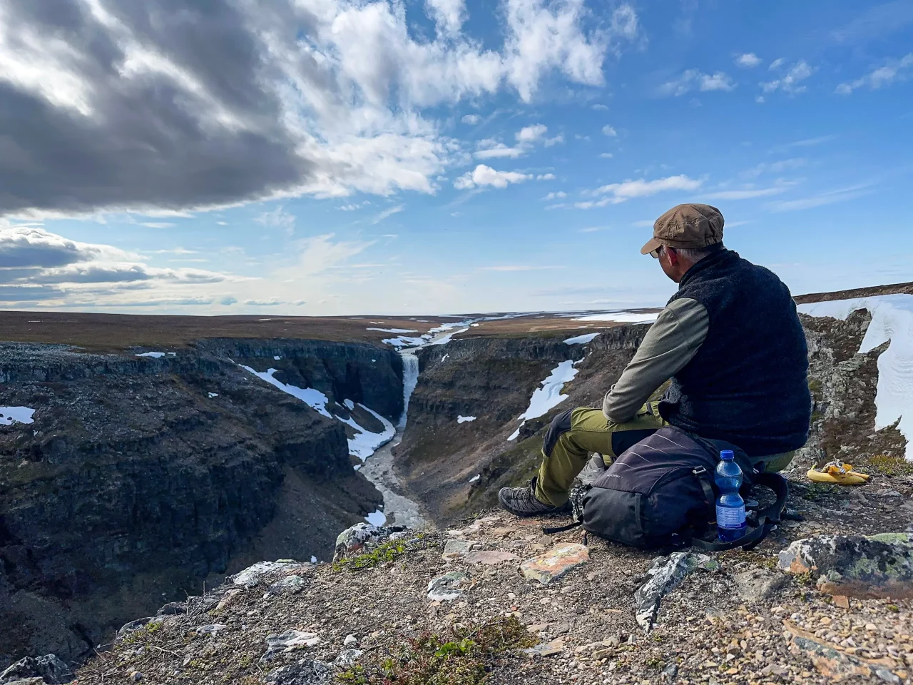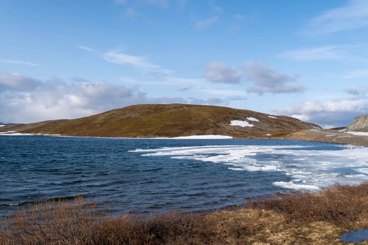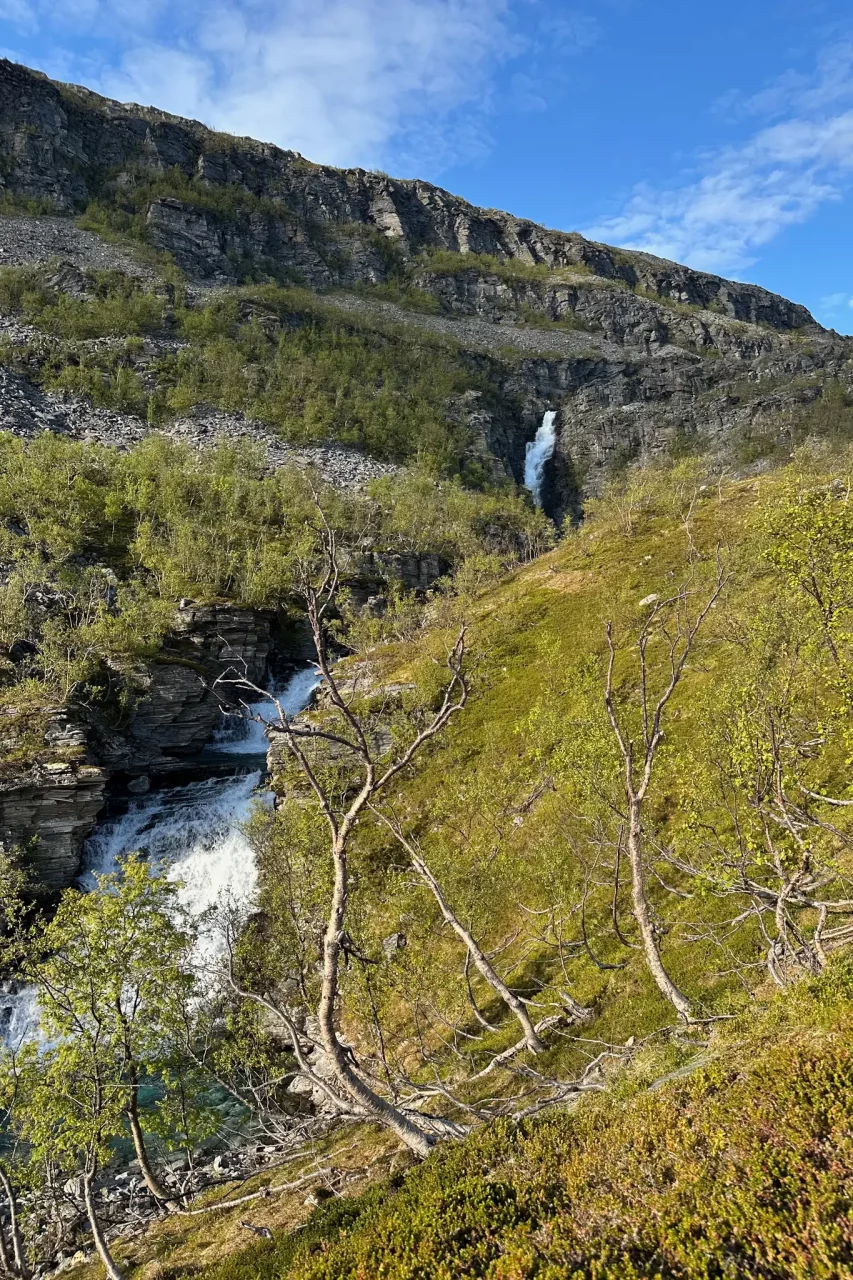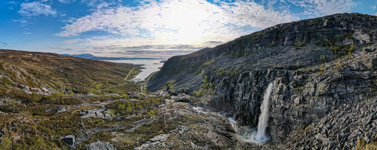 Die Tour ist traumhaft: Diese Weite, der Fjord als blaues Band im Hintergrund, oben auf dem Fjäll noch große Schneefelder – und am Ende ein eindrucksvoller Wasserfall.