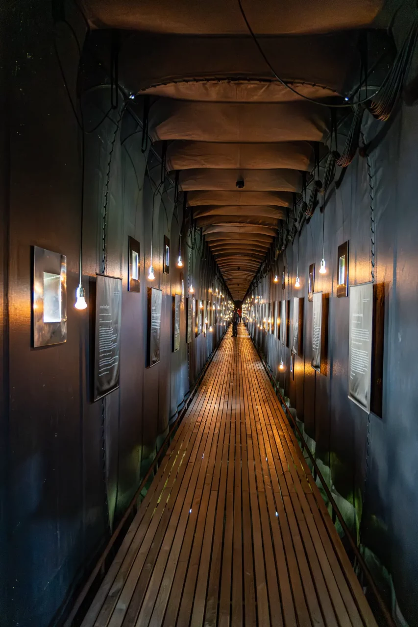 Das Denkmal besteht aus zwei Teilen: einem langen, dunklen Holzgang mit kleinen beleuchteten Texttafeln, die an die 91 bekannten Opfer erinnern. Ich habe einige Tafeln gelesen … echt heftig. Draußen, außerhalb des Ganges, steht in einem Glaskubus ein brennender Stuhl – umgeben von Spiegeln. Ziemlich düster das alles … wie die Zeit damals.