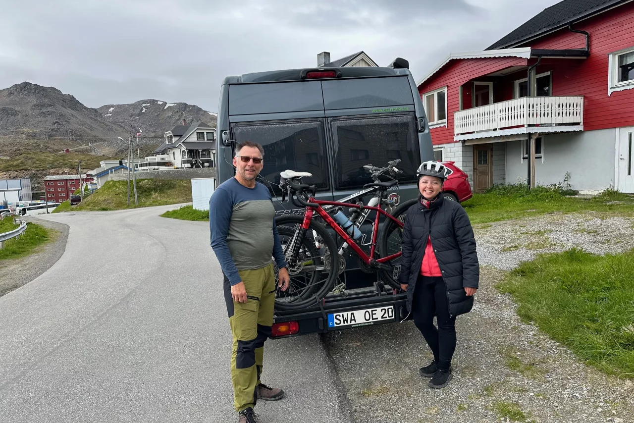 Nach etwa 10 km sehe ich am Straßenrand eine Radfahrerin, die ihr Rad den (ziemlich steilen) Berg hochschiebt. Ich halte an und frage, ob es Probleme gibt. Ein ziemlich verzweifeltes Mädel schaut mich an und sagt, es wäre schon alles okay – sie müsse „nur noch“ bis Honningsvåg zurück. Man sieht ihr an, wie sehr sie sich quält 😩. Als ich ihr anbiete, sie ein Stück mitzunehmen – auf dem Radträger ist ja noch Platz – sagt sie sofort erleichtert: ja 🥲!