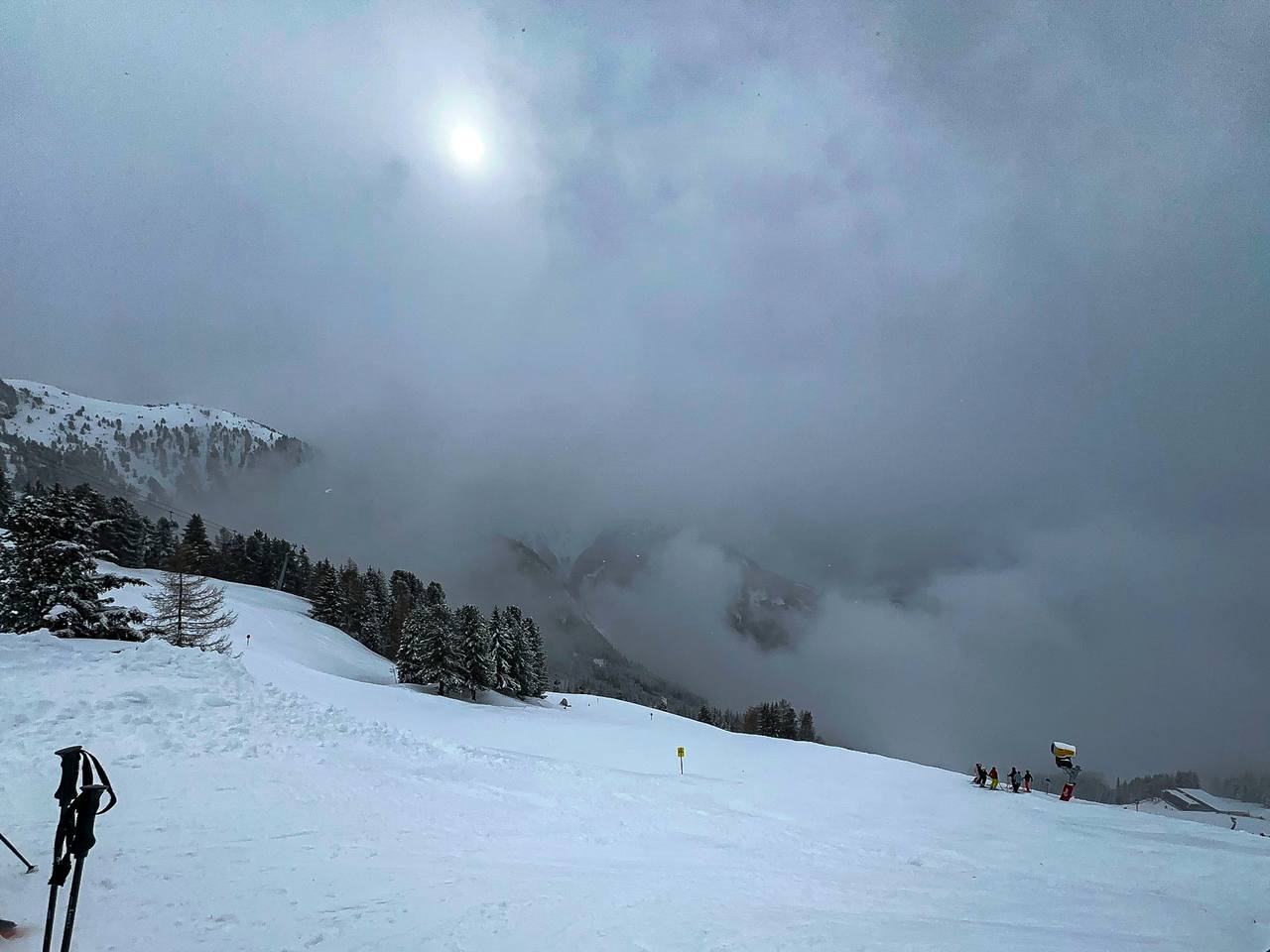 Nach dem Umziehen fahren wir direkt los, der erste Skitag beginnt. Das Skigebiet Jerzens Hochzeiger im Pitztal erreichen wir nach kurzer Anfahrt. Leider ist das Wetter heute eher in der Kategorie „stark ausbaufähig“ einzuordnen. Grau in Grau mit gelegentlichem Nebel und seltenen lichten Momenten. Auch die Schnee Qualität ist bescheiden, aber egal. Das Skigebiet ist eher kleiner, 9 Lifte und 54 Pistenkilometer. Es gefällt mir aber gut, sofern ich bei der bescheidenen Sicht mal was sehe. Ich fahre wieder bei Anja in der Gruppe. Ihr Tempo und ihre Art die Skitruppe zu leiten sagt mir sehr zu. Trotz der bescheidenen Bedingungen fahren wir den ganzen Tag und als wir gegen 15:30 Uhr am Bus sind, sind alle ziemlich erschöpft. Dort erwartet uns ein reichhaltiges Welcome-Sektbüffet und gut gelaunt geht es zurück ins Hotel. Dort angekommen beziehen wir unsere Zimmer und nachdem ich kurz noch in der Sauna war geht es zum Abendessen. Das Essen ist, wie immer im Mozart, ein 3-Gänge Menü und sehr gut. Der Abend fällt danach sehr kurz aus, die meisten sind nach der nächtlichen Busfahrt und dem anstrengenden Skitag doch reichlich müde!