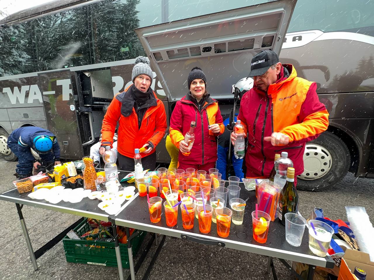 Am 06.03.2024 um 23:00 Uhr geht es los. Stefan fährt auch mit und wir treffen uns traditionell um kurz vor 22:00 Uhr in der Hotelbar gegenüber der Sport-Insel zum Startup. Pünktlich sind wir dann am Treffpunkt an der Sport-Insel. Nach kurzer Begrüßung der anderen Mitfahrer, es sind doch einige bekannte Gesichter dabei, geht es pünktlich los. Da einige Teilnehmer mit dem eigenen PKW anreisen, ist genügend Platz im Bus für eine „bequeme“ nächtliche Anreise nach Landeck.