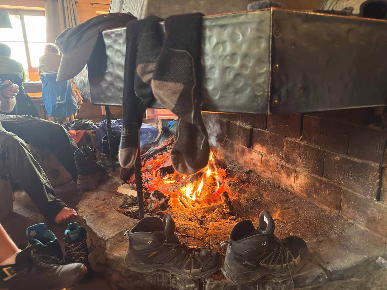 Als ich heute Morgen erwache hab ich auf dem rechten Auge einen grauen Schleier. Augenentzündung ….prima🤦🏻♂️braucht auch kein Mensch. Nach dem Frühstück, heute wieder etwas später das Wetter ist eher schlecht, laden wir den Bus und verlassen das Hotel Kreuz. Wir fahren ca. eine Viertelstunde bis nach Bezau, dem Startpunkt der heutigen Wanderung. Auch heute teilt es sich wieder in zwei Gruppen. Gruppe Thomas wandert hoch zur Niederen Alpe. Gruppe Anja nimmt die Bergbahn und läuft oben eine leichtere Runde. Es regnet inzwischen nur noch leicht und die Gruppen teilen sich auf. Mein Plan ist mit Thomas hoch zu wandern. Aber, seltsam…. wir sind nur 12! Der Rest entscheidet sich für den Lift, da es inzwischen doch etwas mehr regnet…. Wir gehen los und nach ca. 500m ändert sich das Wetter. Wenn es bisher nur leicht geregnet hat, wird es ab jetzt deutlich mehr. Egal, wir sind ja nicht aus Zucker!!!! Im Laufe der nächsten 2,5h ändert sich vieles, nur das Wetter nicht mehr. Die anfängliche Stimmung von „So schlimm wird das nicht!“ ändert sich, spätestens nachdem die Regenkleidung dem Wetter nicht mehr trotzt und durchschlägt, zu „warum tue ich mir das an?“. Meine Augenentzündung verbessert meine Stimmung auch nicht wirklich!! Aber irgendwann ist es dann auch geschafft. Völlig durchnässt kommen wir auf der Niederen Alpe an. Die Ersatz Shirts im Rucksack sind auch feucht geworden, Ersatzhose habe ich keine dabei. Irgendwie versuchen wir am offenen Kaminfeuer den Rest der Kleidung zu trocknen. Naja…. so wirklich Erfolg haben wir nicht, aber warmfeucht ist besser als kaltnass!
